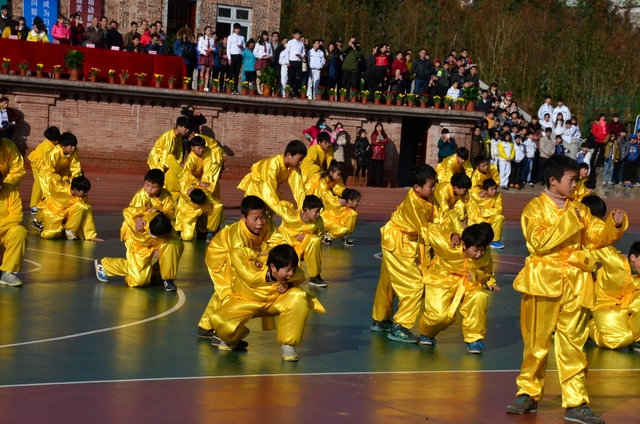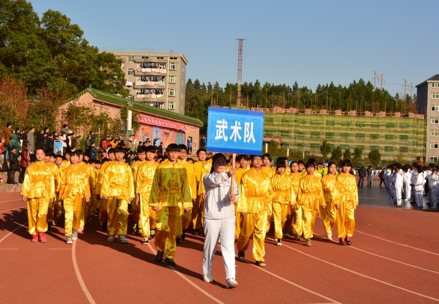 卧似一张弓,站似一棵松,不动不摇坐如钟,走路一阵风。南拳和北腿,少林武当功,太极八卦连环掌,中华有神功 ——这是英姿飒爽的武术队 。