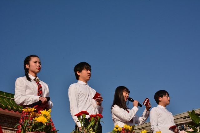 紧接着入场的是正源学校校旗队。内“正”外圆的校旗告诫我们,要端端正正做事,方方正正做人。着眼于今天,刻苦学习,掌握本领;放眼于未来,驰骋世界,翱翔宇宙。以敢打敢拼、敢为人先、不到长城非好汉、学不成名誓不还的正源精神,谱写正源学子壮美的人生篇章,创造正源学校百年辉煌!