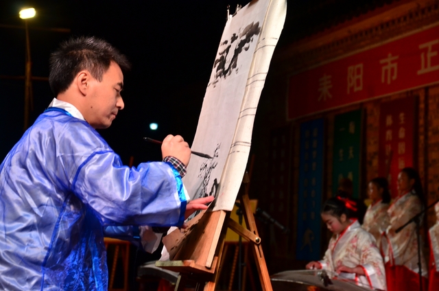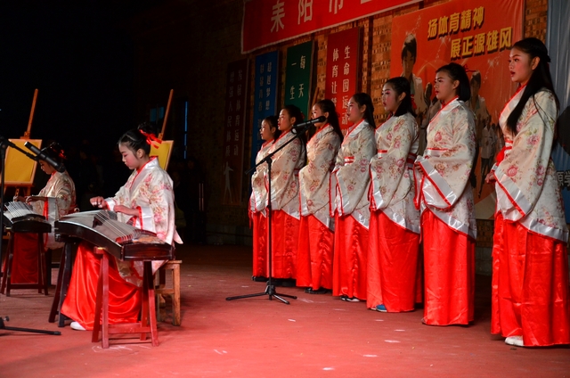 悠悠古筝曲 /浓浓墨翰香/ 暖暖春江水 /深深游子情/一轮明月 慰藉江畔的冷寂/’霓裳羽衣 旋转盛世的光彩.。被闻一多先生誉为“诗中的诗,顶峰上的顶峰”的《春江花月夜》,由潘满萱、刘娟等演奏,让观众如醉如痴,余音绕梁。