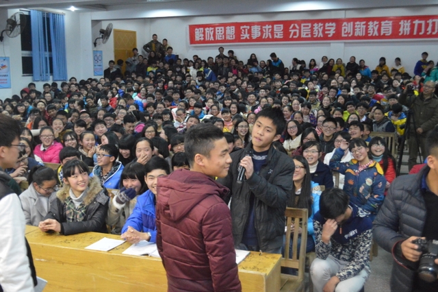2016年1月27日晚,正源学校报告厅座无虚席,门口也挤满了人,一堂由从正源走上大学的大学生主持的宣讲会正在举行。