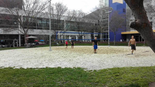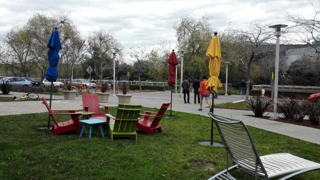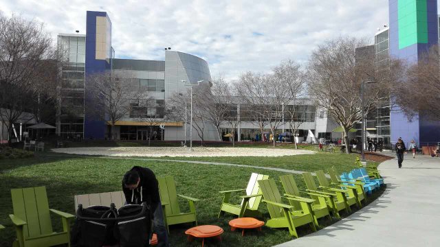 总部地标性建筑物前,大草坪上撑着象征Google代表色(红、黄、绿、蓝)的大洋伞,好像游乐园。中午时,这些五彩伞下都是出来吃午饭的Google人,晒晒太阳聊聊天,其乐融融,不知不觉中增强了团队的凝聚力。