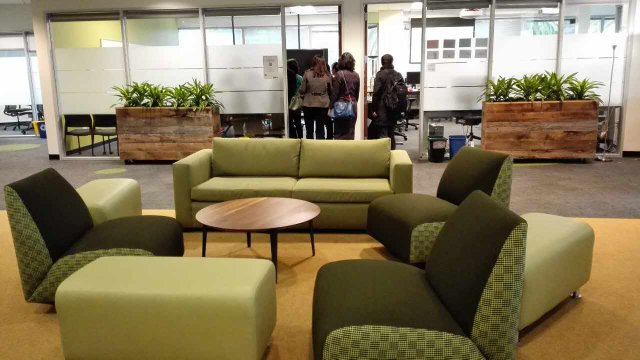 据领队介绍,所有员工进了谷歌这个独立王国后吃喝玩乐全部免费,这点倒是和正源很像。尽管这里据说有一两万员工,但这里却非常宁静,到处是沙发,长椅供员工休息。
