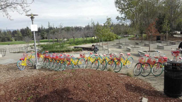 Google倡导低炭环保,自己更是身体力行。园区间布满Google代表色的自行车,把手上没有刹车,靠踏脚板控制,供员工锻炼和通勤。