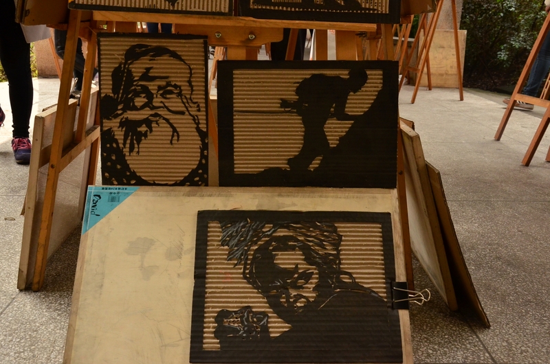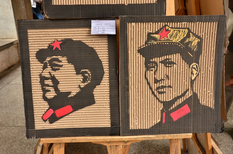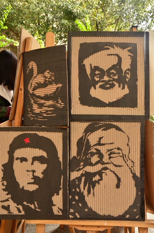 山枫艺谷艺术学校老师王正华(左一)、唐黎明(左三)和美术培训班布展学员