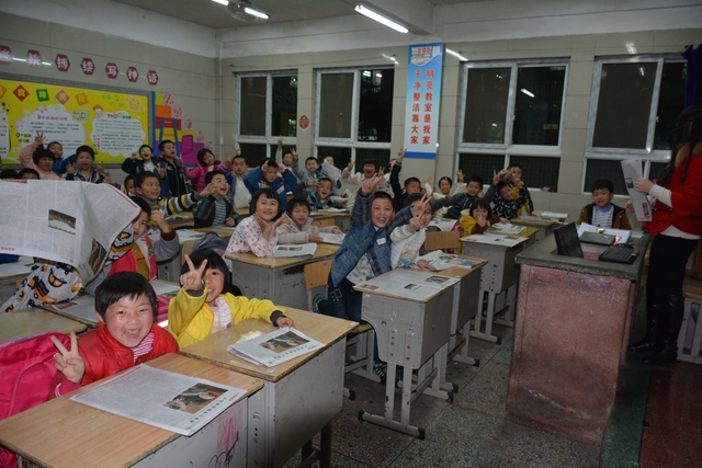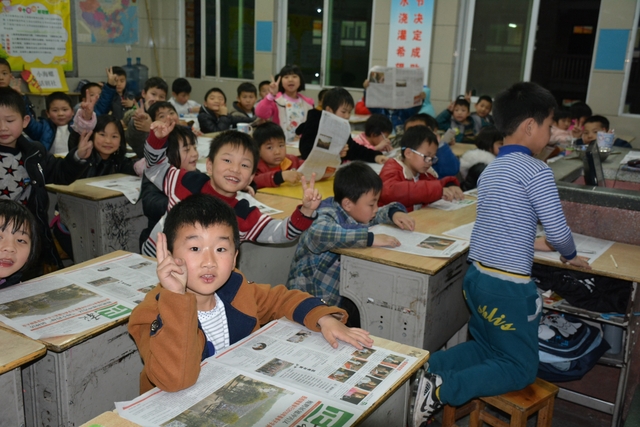 领了报纸后,欢呼雀跃的小学生