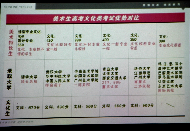 准高一年级主任陈斌在会上作了表态性发言。他说,年级已经配备最优秀教师,教好文化课,决不让文化分数拖高考后腿,确保专业分数上线学生文化分数百分之百上线,力争届时首届美术高考一鸣惊人,一大批学生考进一流美术学府,甚至顶尖级美术学府。