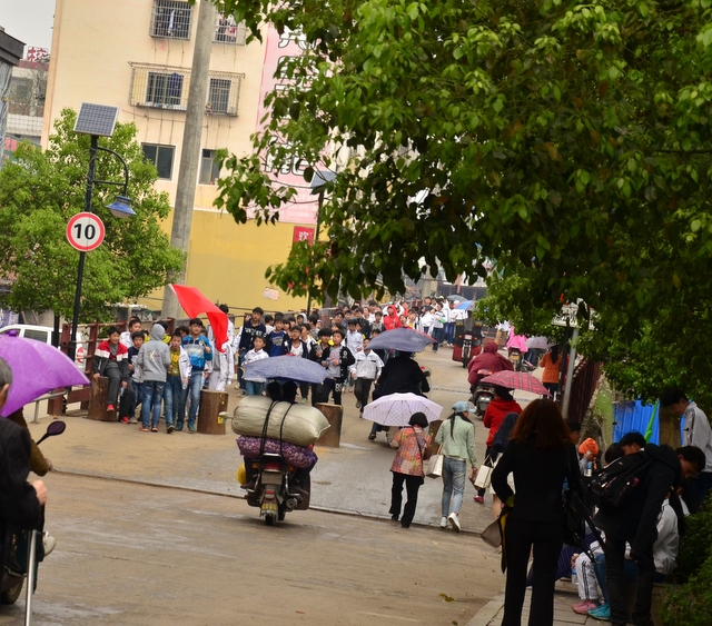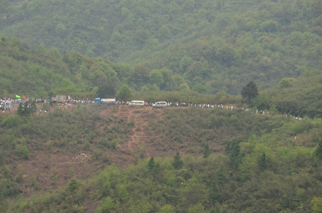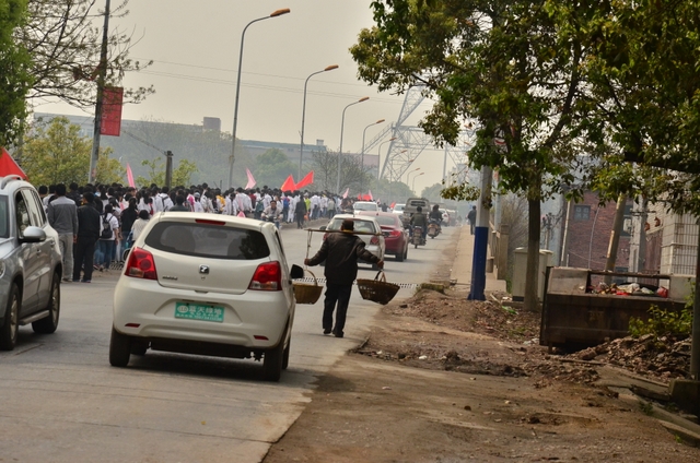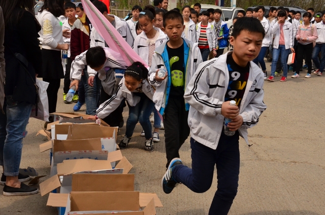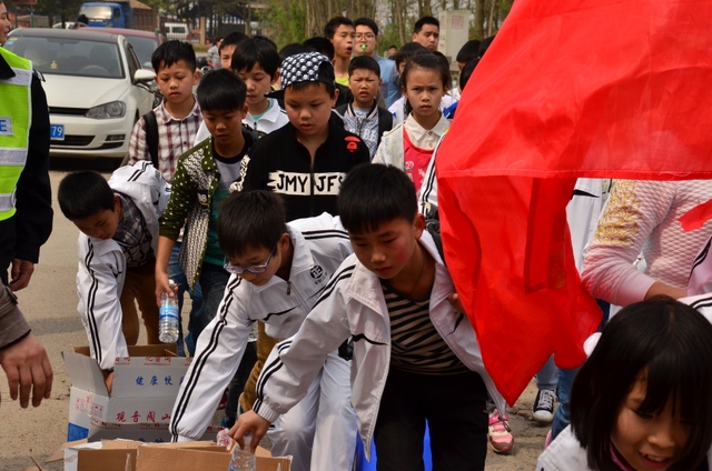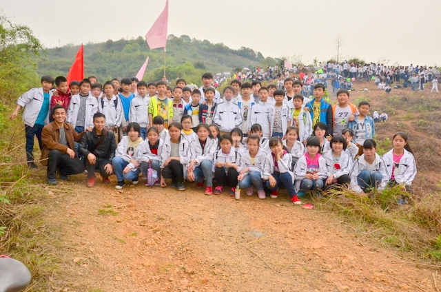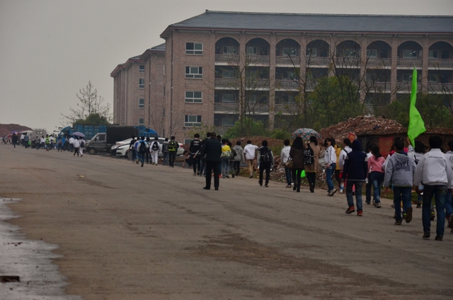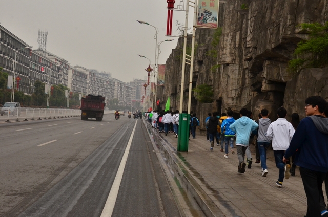 小憩后,2000人的远足队伍经金南往大唐电厂方向前行。在电厂近郊,后勤处人员发放矿泉水,一件件的矿泉水整齐排在马路边,箱盖打开,经过的学生每人弯腰拿一瓶,非常自觉,不得不惊叹于正源平时对学生的养成教育。学生经过后,后勤人员将空纸箱折好用车子带走,路上不留一片纸屑。一路走来,路上车子减少,前行速度加快,同学们一路欢声笑语往前行。行之愈快,离鹿岐峰愈近,同学们也就愈兴奋。