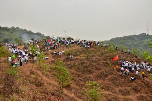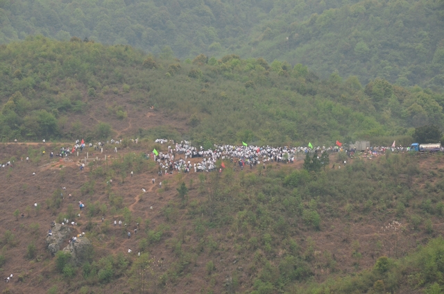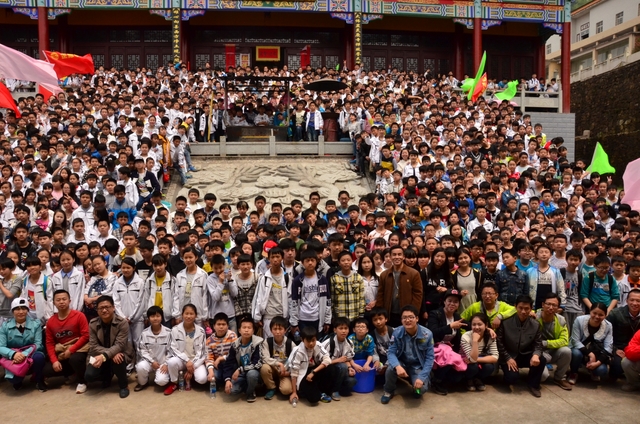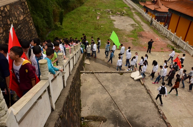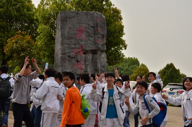11点半钟,远足队伍陆续到达鹿峰寺。同学们到达目的地的兴奋与豪迈溢于言表。有高声大喊的,有如释重负的,也有提示宗教圣地不许喧哗而应脚步轻声言行庄重的。宗教圣地鹿峰寺,因鹿歧峰公园建设的需要,正大兴土木搞建设,一派热火朝火的景象。事不凑巧,明天是观世音菩萨生日,今明两天寺庙大做法事,僧众信徒众多,无法接纳这么宠大的一支学生队伍。经交涉,2000学生集中在大雄宝殿前合影留念,算作到此一游的标志。学生们继续往峰顶攀登,一些老师为弥补参观寺庙时机不巧的遗憾,向学生讲述鹿峰寺的历史,宗教文化,八卦井的故事,学生们听的津津有味。