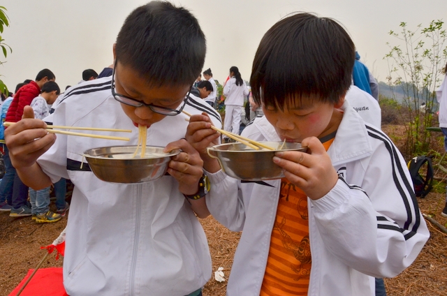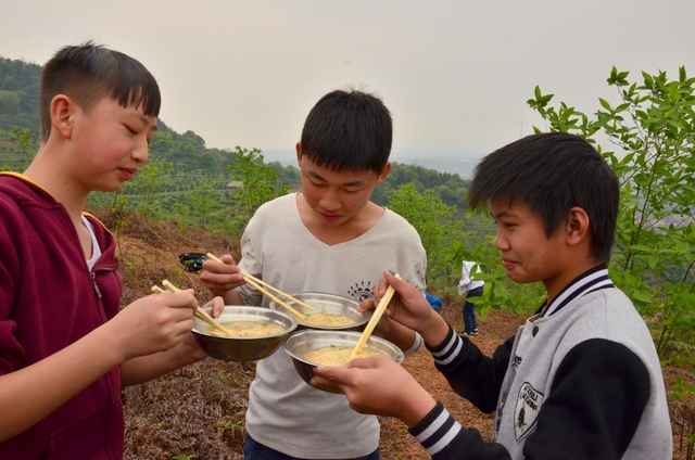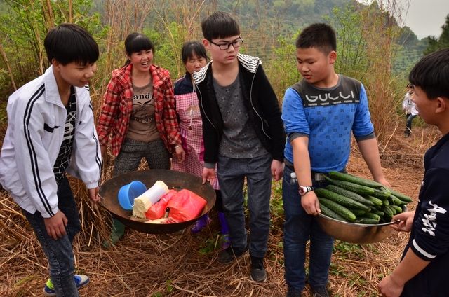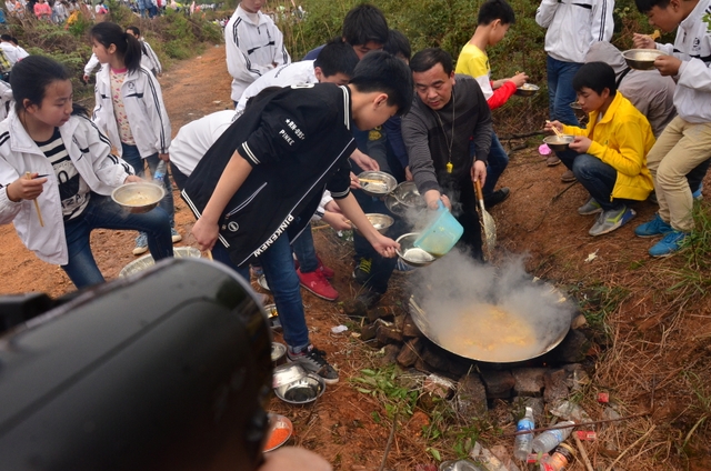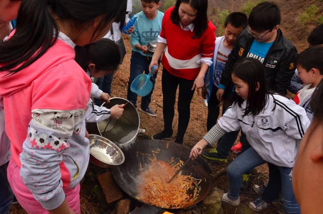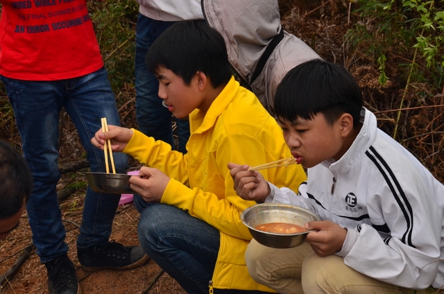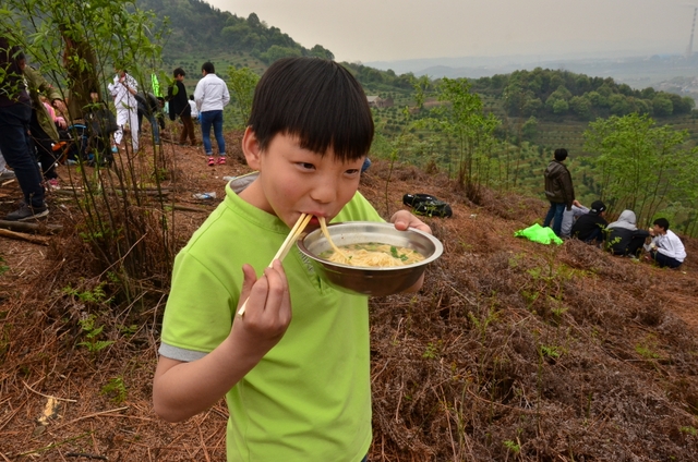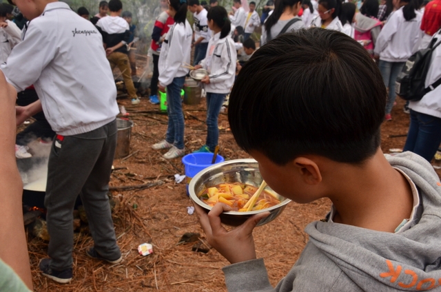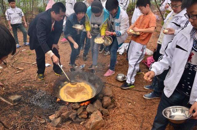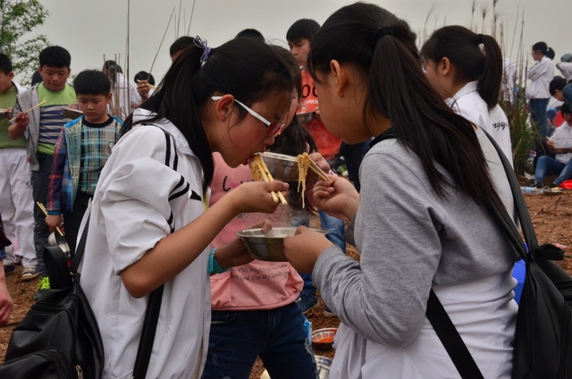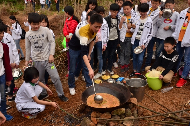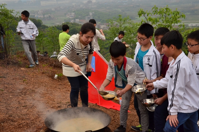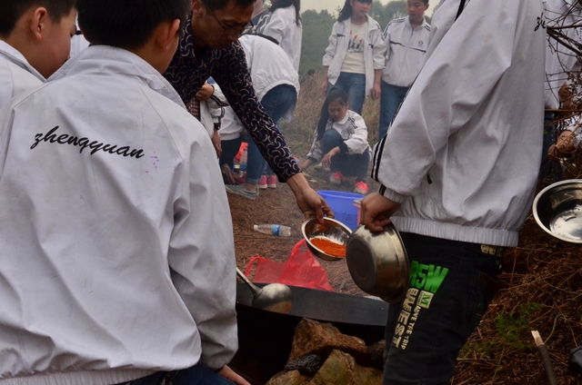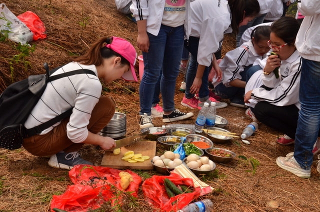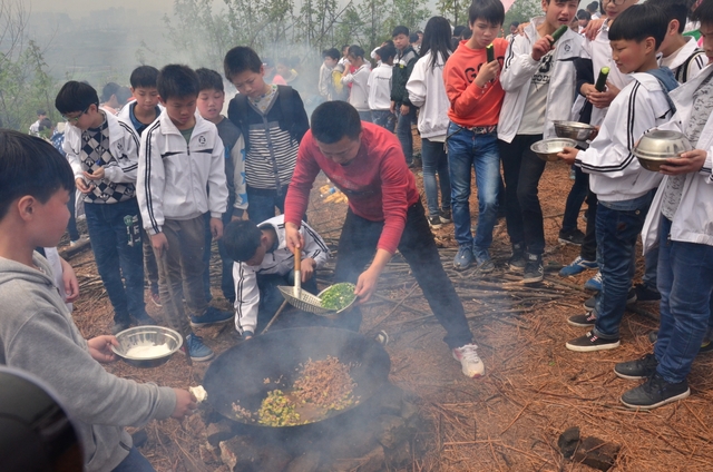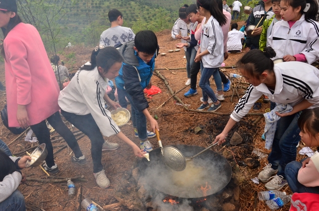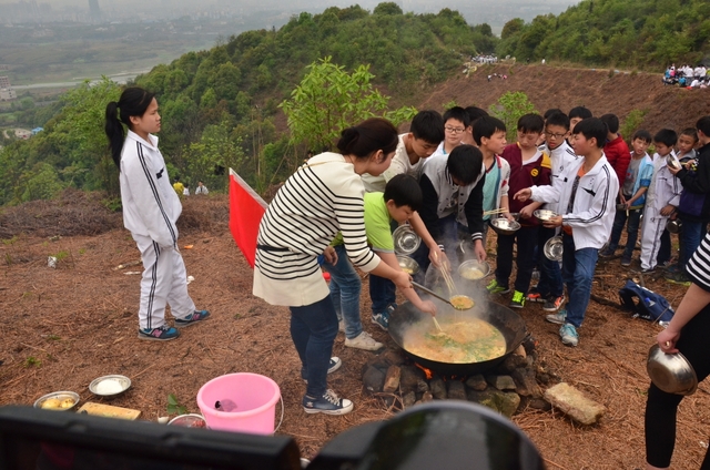 绕过峰顶,到达峰顶下山的一面坡,许多学生顿生“山登绝顶我为峰”的豪迈。这块山,近一两年挖过,草木枯萎,便于埋灶野炊,后勤处的几辆后勤保障车及后勤师傅们早已候在这里,于是便分班埋灶野炊。洒水车拖来大车的干净食用水,运输车运来大堆的黄瓜、土豆、面条、面粉、饺子馅及佐料。同学们有说有笑,自觉分工:有捡柴火的,有打水的,有领食品的,有包饺子的,还有扯野笋籽扯野厥莱的。有的学生找断砖头和断石头垒灶,有的拿镢头挖灶再用石头塞紧。大家公认,食堂一位老师傅的灶垒得最好,既好看又实用,原来年轻时在部队当过炊事班长,实践中练就的真本事。后勤处的同志分几个人逐班检查,有不熟的就指导几句或手把手教几手。也有老师亲自示范的,一看那架式,就知是老把式。由了人多力量大,同学们快的20分钟左右就开始吃第一锅。有相互推谅的,无争先恐后的。尽管许多学生都已肚饿,但自觉排队,秩序井然。虽然煮的速度较快,但由了人多,有的班要煮4至5锅。本人顺便问学生的感受,有说虽然辛苦,但苦中有乐。有说虽非山珍海味,但吃起来别有滋味,因是自己动手做的。还有一调皮的女生说,尝到了世界上最好吃的滋味,因走了这么远,肚子早饿了,因饥饿就是世界上最好的美味。吃饱吃好后,各班围着火炉合影,青春飞扬,算作初一年级最好的纪念。同学们收好碗筷,清理完杂物及余火,逐步下山返校。留在最后的后勤人员在检查杂物余火时,没发现任何隐患,不得不对学生的自觉行为啧啧称赞,不得不对正源老师的组织能力钦佩不己。