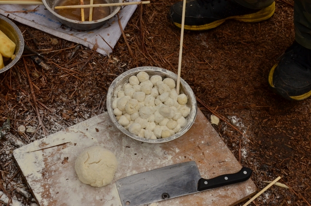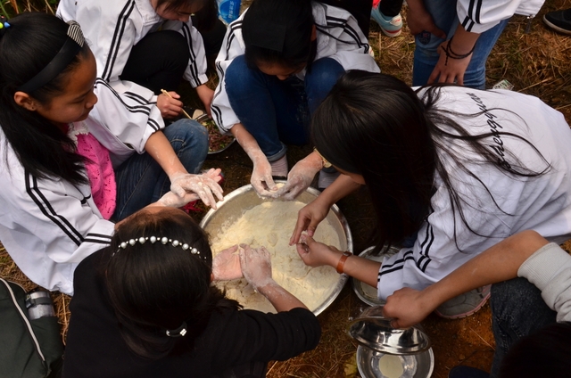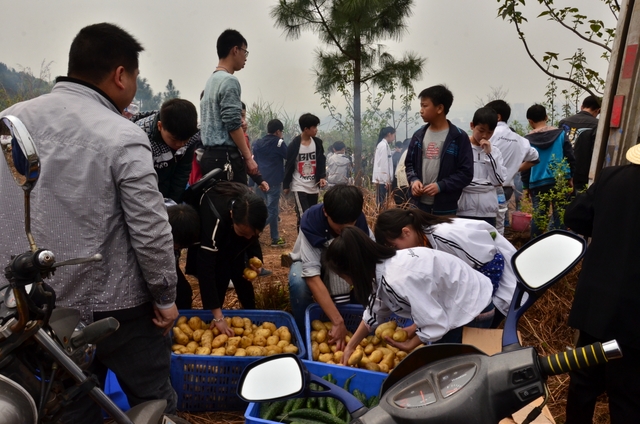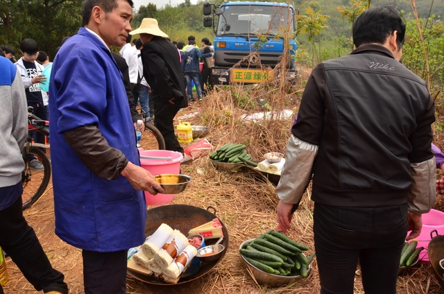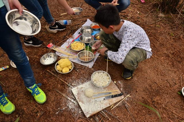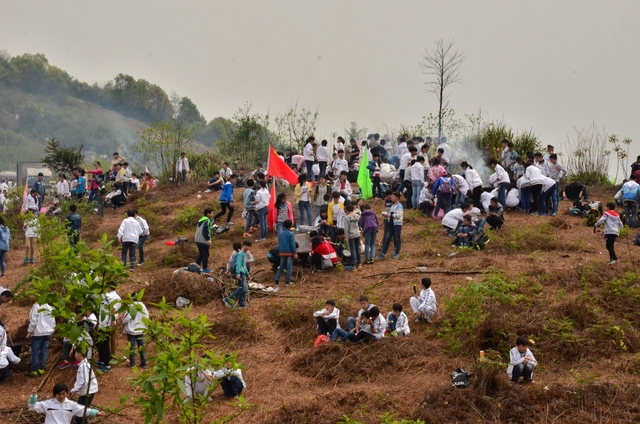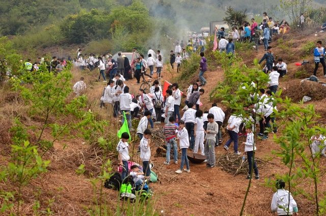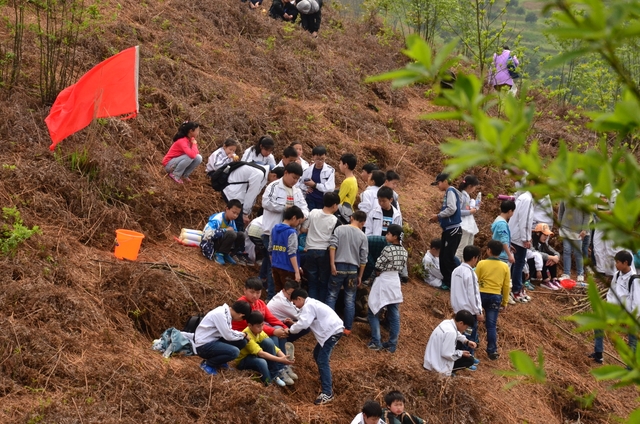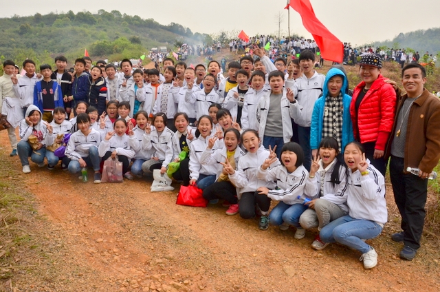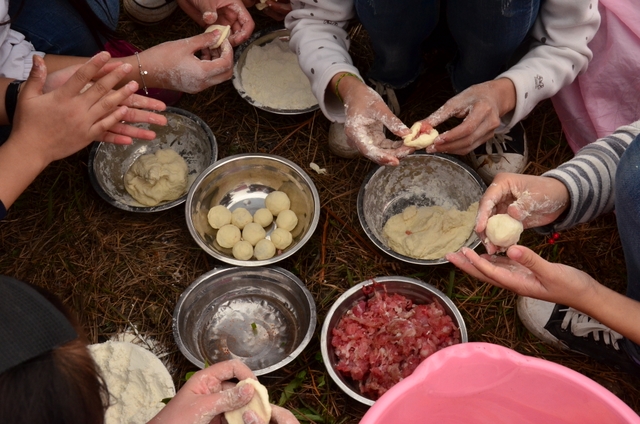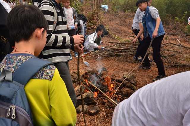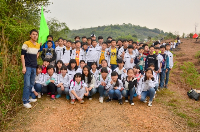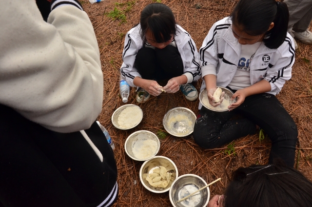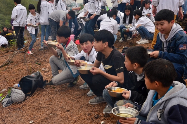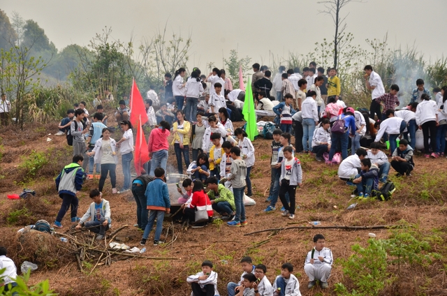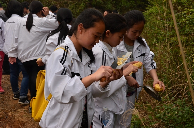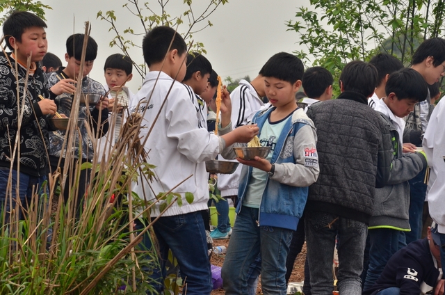 绕过峰顶,到达峰顶下山的一面坡,许多学生顿生“山登绝顶我为峰”的豪迈。这块山,近一两年挖过,草木枯萎,便于埋灶野炊,后勤处的几辆后勤保障车及后勤师傅们早已候在这里,于是便分班埋灶野炊。洒水车拖来大车的干净食用水,运输车运来大堆的黄瓜、土豆、面条、面粉、饺子馅及佐料。同学们有说有笑,自觉分工:有捡柴火的,有打水的,有领食品的,有包饺子的,还有扯野笋籽扯野厥莱的。有的学生找断砖头和断石头垒灶,有的拿镢头挖灶再用石头塞紧。大家公认,食堂一位老师傅的灶垒得最好,既好看又实用,原来年轻时在部队当过炊事班长,实践中练就的真本事。后勤处的同志分几个人逐班检查,有不熟的就指导几句或手把手教几手。也有老师亲自示范的,一看那架式,就知是老把式。由了人多力量大,同学们快的20分钟左右就开始吃第一锅。有相互推谅的,无争先恐后的。尽管许多学生都已肚饿,但自觉排队,秩序井然。虽然煮的速度较快,但由了人多,有的班要煮4至5锅。本人顺便问学生的感受,有说虽然辛苦,但苦中有乐。有说虽非山珍海味,但吃起来别有滋味,因是自己动手做的。还有一调皮的女生说,尝到了世界上最好吃的滋味,因走了这么远,肚子早饿了,因饥饿就是世界上最好的美味。吃饱吃好后,各班围着火炉合影,青春飞扬,算作初一年级最好的纪念。同学们收好碗筷,清理完杂物及余火,逐步下山返校。留在最后的后勤人员在检查杂物余火时,没发现任何隐患,不得不对学生的自觉行为啧啧称赞,不得不对正源老师的组织能力钦佩不己。