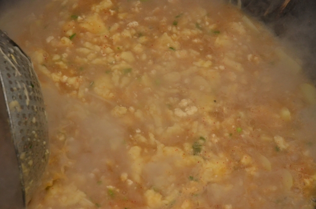 一看这班主任就是搞个多次野炊的:为了煮的面好吃,在如此简陋的条件下,竟然把瘦肉、土豆、葱花先用油炒一下。