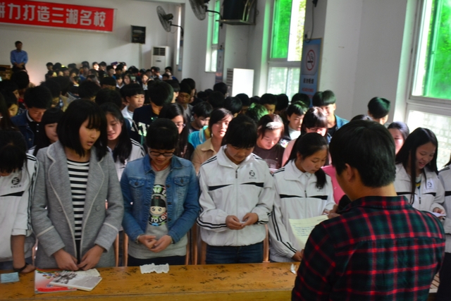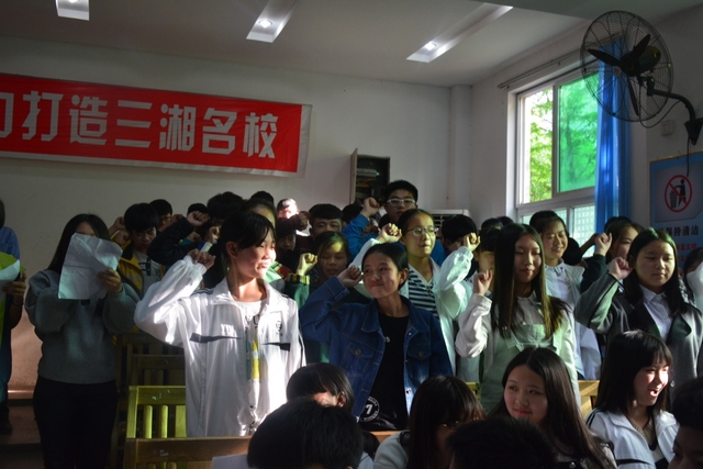 初三年级10个班,以班为单位,每个同学高举右手,在领誓同学的带领下,以青春的名义宣誓,吹响中考集结号,拚搏两个月,让人生在六月闪光,让梦想在六月飞翔。
