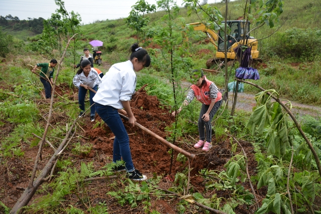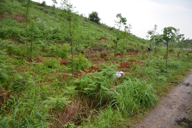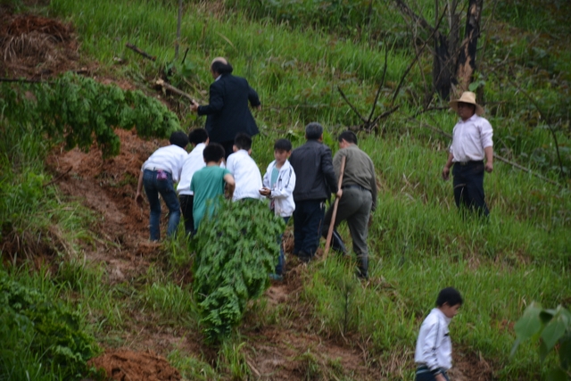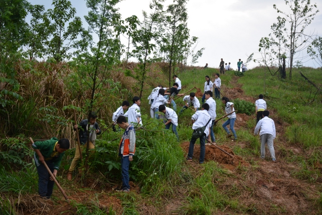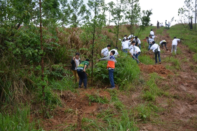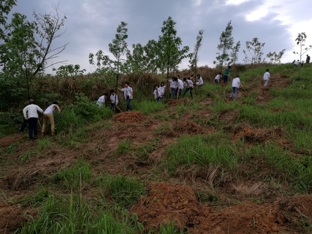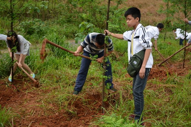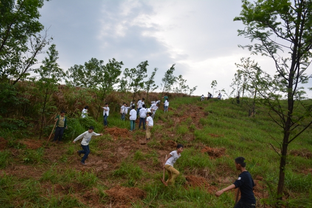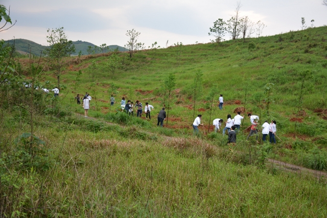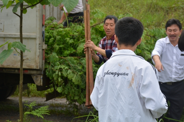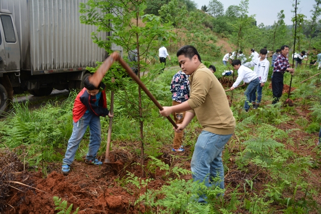 正源学校工程部的人早早等候在工地边,他们满面笑容向前来参加劳动的学生发放劳动工具、水杉树苗。按老师要求,同学们三个人为一个小组,组内自己分工合作,抬树苗,放树苗,扶正,培土,踩实。每一个同学都尽自己所能,不怕苦,不怕脏,高高兴兴,毫无怨言,以自己能为学校的农场增添一抹绿色而自豪。昔日荒凉的小山坡,一下子成为欢乐的海洋。