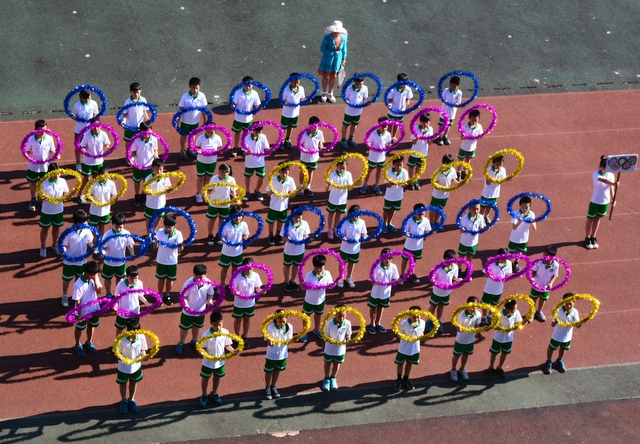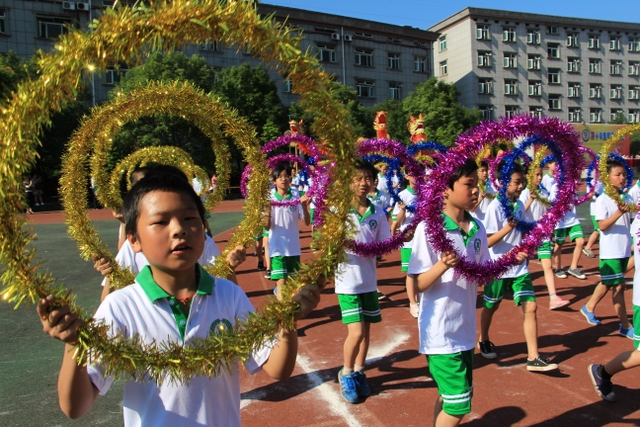 开幕式伴随着激越的运动员进行曲开始,四名英姿飒爽的小学生运动员迈着矫健的步伐,拉着鲜红的国旗四角从主席台走过;伴随着国旗进场的,还有正源师生心中的校旗;五彩缤纷的彩旗队走过展阅台,彩旗迎风招展, 煞是好看; 五颜六色的花环队激情奔放跑过主席台,象征着校园生活多姿多彩, 预示着体育比赛精彩纷呈; 几条金龙腾云驾雾掠过主席台,龙凤呈祥, 平添喜庆; 跆拳道小选手精神抖擞地快速奔过, 这种集竞技娱乐于一体的武道运动, 是正源小学生体育运动的一大特色; 身穿金黄色上衣的武术队斗志昂扬经过主席台, 这种以强身健体为主、以搏击争斗为辅的运动,是正源体育教学的另一特色;竹笛队和吉它及尤克里里两个方阵走过主席台, 这是正源音乐教学及课外特长教育的两支生力军, 口中吹出美妙的旋律, 指尖弹出悦耳的音韵。特殊方阵队之后, 是小学一年级至六年级依序入场, 他们或舞花束, 或挥小旗, 或戴手套; 笑脸多灿烂, 口号多响亮, 脚步多铿锵。最后入场的是学前班的幼儿运动员,脸上稚嫩,笑声清脆,脚步轻快,人见人爱。