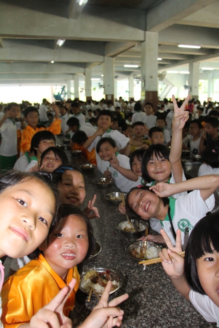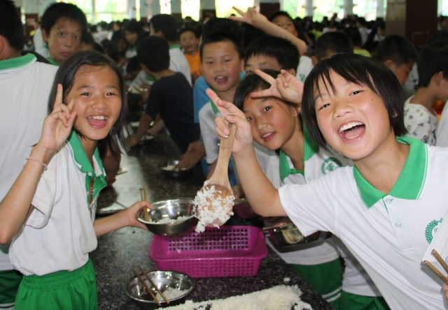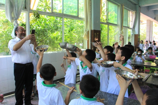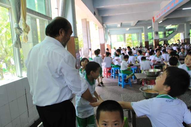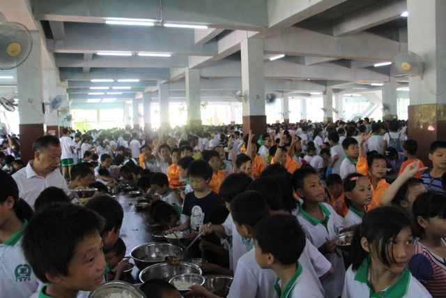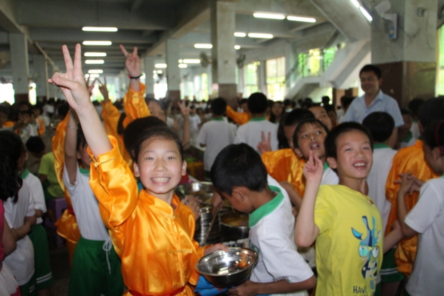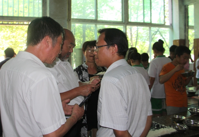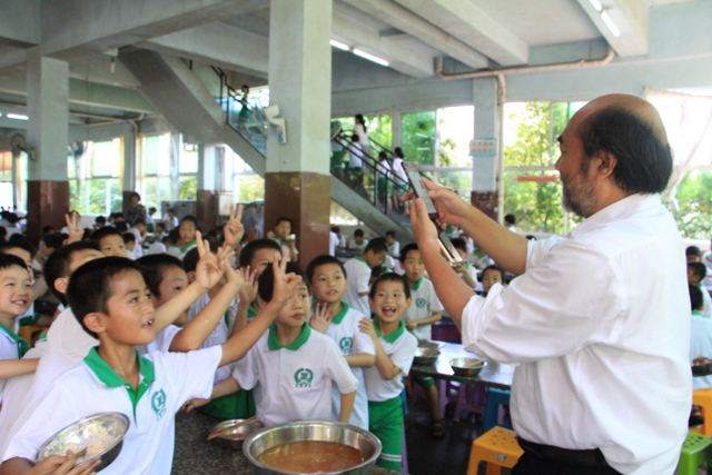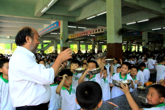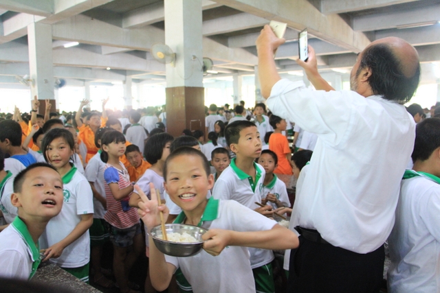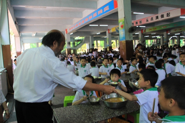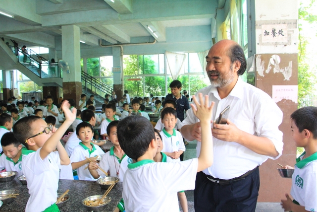罗校长的讲话赢得长时间的热烈掌声。之后,罗校长拿起碗筷,盛上同学们一样的饭菜,有滋有味地吃起来。