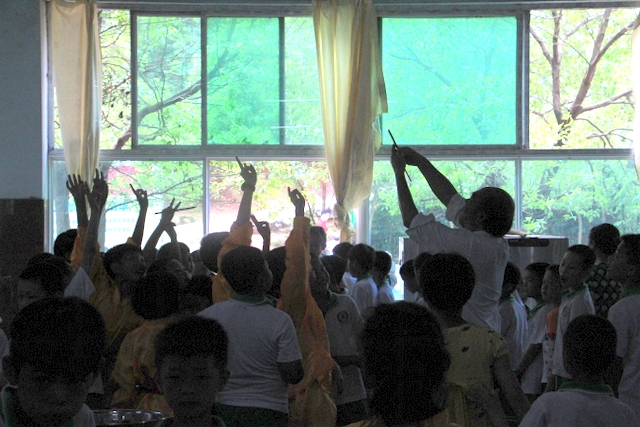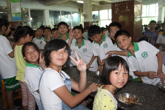 罗校长看了餐厅里热气腾腾的菜,有粉蒸肉,回锅肉,土豆片炒肉丝,豆角炒肉丝,红烧鱼块,西红柿蛋汤,等等,每个同学基本上是两菜一汤。看到同学们吃得津津有味,吃得那么开心,个个红光满面,精神焕发,感到由衷欣慰。