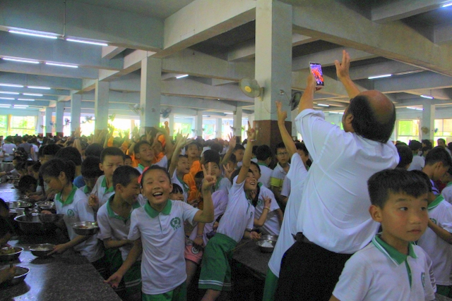 罗校长刚走进一食堂正门口,附近的学生便沸腾起来,“校长好”“罗校长好”“校长伯伯好”的叫声此起彼伏。罗校长拿出手机拍照,同学们争相抢镜头,做手势,天真的脸上洋溢着快乐。