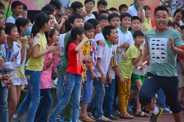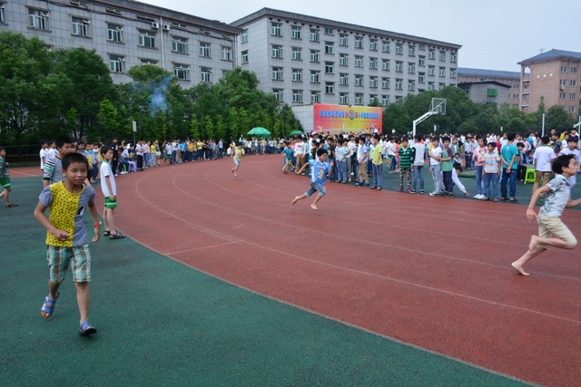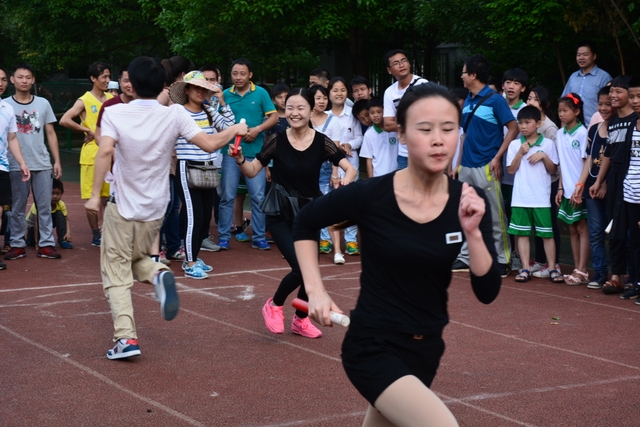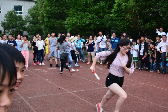 为给同学们的运动会助兴,运动会筹办组特组织了小学部三支教师代表队也参加20人*100m迎面接力赛,分别为一、四年级组为一队,二、五年级组为一队,三、六年级组为一队,每队10男10女,其中允许2位体育老师助兴参赛。这场接力赛更是把运动会推向了高潮!加油声、呐喊声此起彼伏,有震天动地之感,场上老师们更是不能愧对心爱学子的这一片热切期望,他们谁也不甘示弱,如猛虎下山,又似蛟龙腾海,风驰电掣般闪过跑道,引起一阵阵更大的惊呼和加油声!