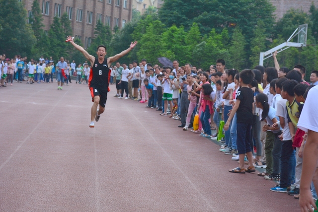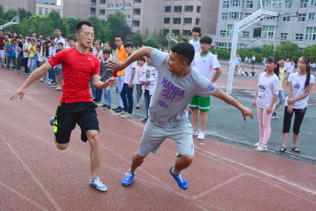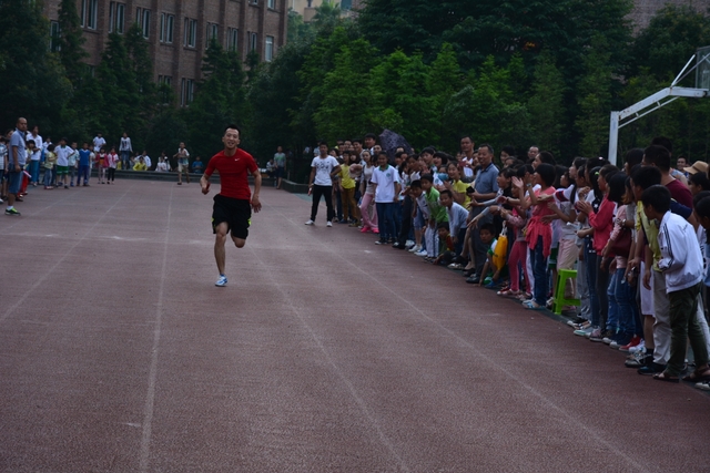 高潮一波接着一波,之后体育组又临场安排了小学部、初中部、高中部体育老师3人*200m接力赛表演。当三位径赛体育专业老师环操场飞奔一圈表演接力赛时,他们如一个无形的巨大磁场,带动了整个运动场的飞奔、旋转,让人不得不惊叹:好一场飞人表演!好一个盛大的别开生面的运动会!