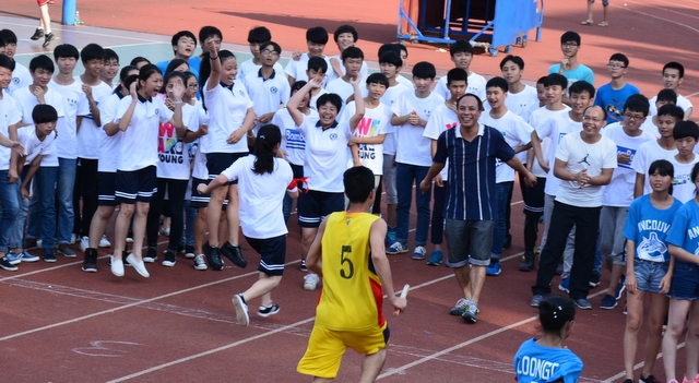 班级接力赛后,初三教师代表队与189、182两个班的学生代表队进行了师生友谊表演赛。