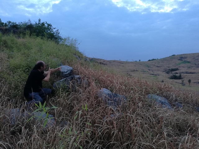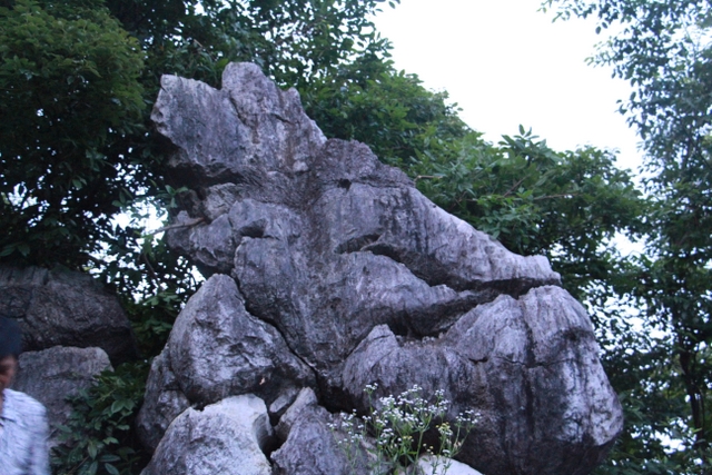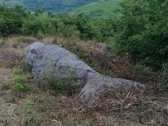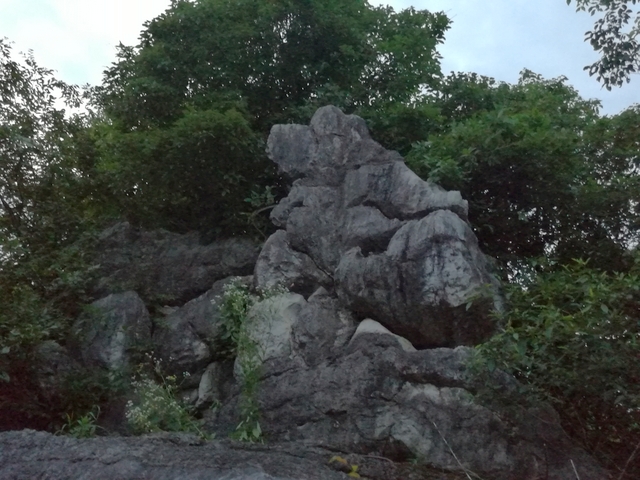 上山容易下山难, 赚取行人错喜欢; 正入万山圈子里, 一山放出一山拦。好马不吃回头草,好汉不走回头路,向导罗育善引导大家从左手边下山。经过一条古战壕,直接往山下走,到了半山腰,终于见到了灵巧的石猴。为让大家看得真切,罗向导爬上石头折断了覆盖在石猴头上的树枝,下来后又指导大家的拍摄角度,于是大家又是一阵狂拍。大家边拍边议论,说石猴还是不怎么形似,最多也只是神似,大家要开动机器,动动脑筋,发挥想像力。我说将上部石猴的头部略去不看,只看下面部分,觉得更像一只机灵的兔子;如果一定要去看整体,我倒觉得更像一只睿智的山羊。罗育善会长总结似地说:“不管是石鱼还是石猴,都是吉祥如意,好的预兆。鱼,寓意年年有余,又预示鲤鱼跳龙门;猴,寓意聪明机灵。总之说明这里人杰地灵,人才辈出!”