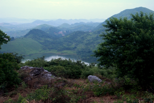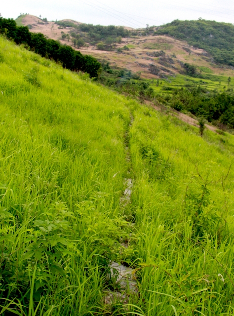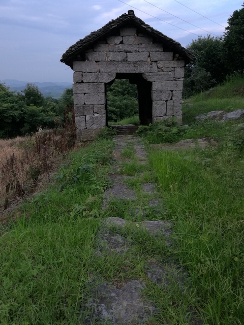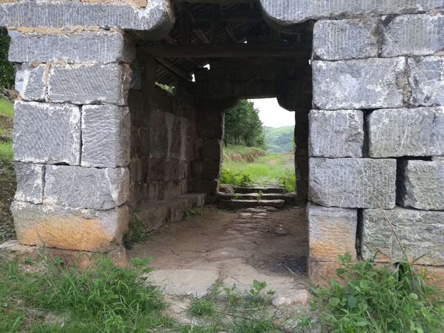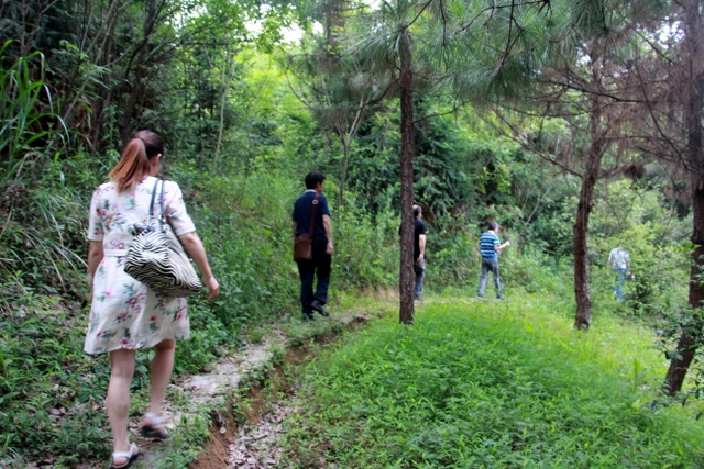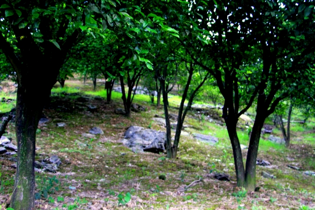 爬过了山坡,到了一片视野开阔的山梁。从上往下看,过去应是一面菜地,现在无人耕种,己经荒芜了,但仍以草地为主,土坎上的偶尔几株灌木为辅。山脚下一口50平方米左右的山塘水库,水大致很深,才会孕育肥大的鲤鱼。路边长满矮短的荆棘,树上结满了青涩的果实,向导罗育善介绍是山楂树,秋天才会收获一捧捧红色的山楂。还有青青的枝条特别嫩的俗名“江棘柴”,端午时煮水给小朋友洗澡,一个夏天不会长“沙痱子”等热毒。罗育善一边喊各位同志快点走,前面有个古亭子,看山上石鱼就不远了;一边又介绍龙形山的来历,说从山下远处看,山脉蜿蜒宏伟,象龙的形状,尤其是山上一块块白色的石头,远看确实像龙鳞。大家任由向导罗育善催喊,仍就漫不经心边拍边走,有的从各个角度拍一棵长满“桑扶籽”的桑树,有的拍山下明境似的水库,有的拍山对面的一列列飞驶的高铁。