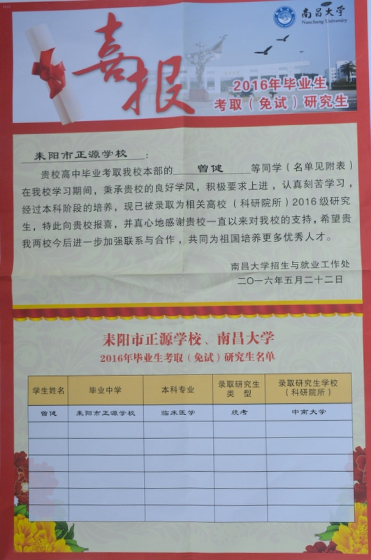 日前,南昌大学发来喜报:从我校考入南昌大学的曾健同学以优异成绩考取了中南大学2016级研究生。
