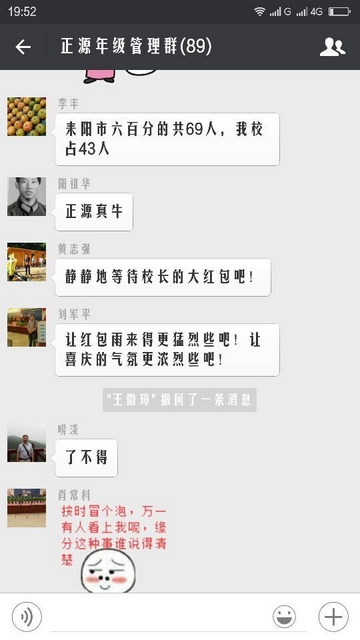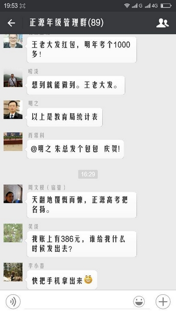 办公室里沸腾了!微信群里沸腾了!罗校长、梁总监在微信里发起了红包,高三年级主任朱明之发起了红包,其他相关人员不停地抢着红包,也情不自禁地发着红包。没有抢到红包的老师强烈地要求校长、梁总监再发第二轮、第三轮红包,门庭若市,热闹非凡。宿管部主任周文根即兴来了两句:天翻地覆慨而慷,正源高考把名扬。宣传处郑少君主任马上接了两句:各项指标居第一,连年神话震三湘。