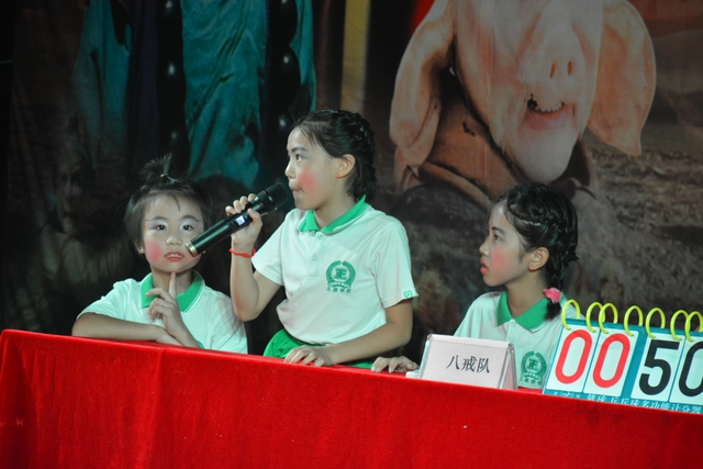 整台比赛在《大王叫我来巡山》的舞蹈热身中徐徐开启。必答题、抢答题、朗读题、风险题、才艺展示题,从易到难,层层推进;不管角度如何,不管形式怎样,知识包罗万象,皆不脱离文学名著《西游记》。八戒队、沙僧队、悟空队、唐僧队四支队伍既在必答环节依序进行,又在抢答环节争先恐后,还在才艺展示环节各尽所能。正源版的《三打白骨精》将才艺推上高潮,告诉了师生“僧是愚氓犹可训,妖为鬼域必成灾。金猴奋起千钧棒,玉宇澄清万里埃。” 唐僧队的《小话西游》穿越时空,将快板、情景模拟、讽刺、搞笑融为一炉,真是别样的解构,别样的品读。