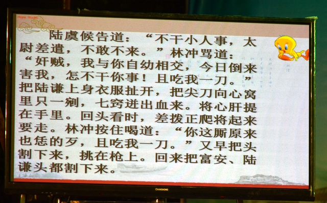每两个环节之间穿插了互动和娱乐节目。互动节目为暂时领先的代表队抽签两个班级,一方说人物特征,另一方猜相应人物,猜对了获得纪念品。这时台下一片欢呼声,每一个班都希望能上台一展身手。相声《读好书》、话剧《智取生辰纲》、武术《男儿当自强》、舞蹈《大王带我来巡山》,或诙谐幽默,或活灵活现,或虎虎生风,或舞姿轻扬,让观众从扣人心弦的紧张氛围中放松开来。最后,再由几十名同学走上舞台,罗校长亲自带领台上台下的全体学生齐声高唱《好汉歌》,响彻云霄,气贯长虹,把这个活动推向高潮!