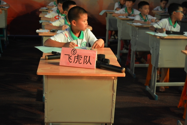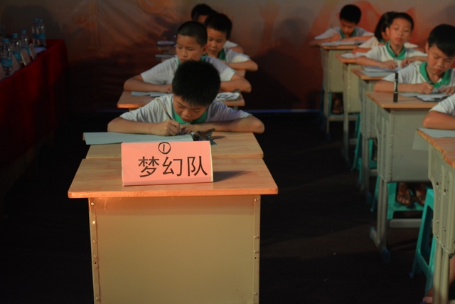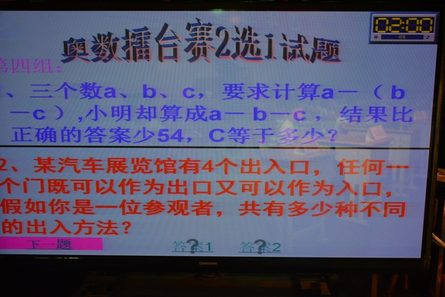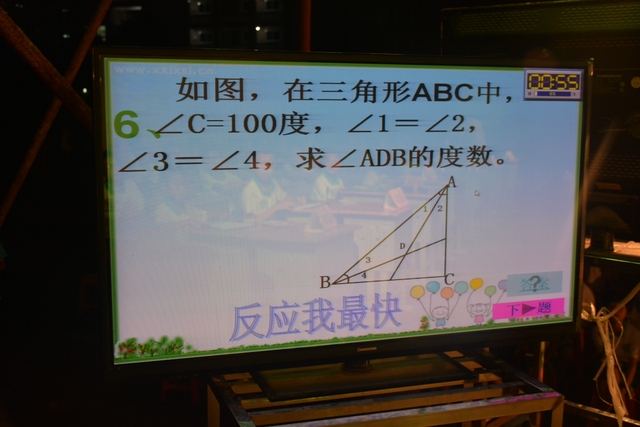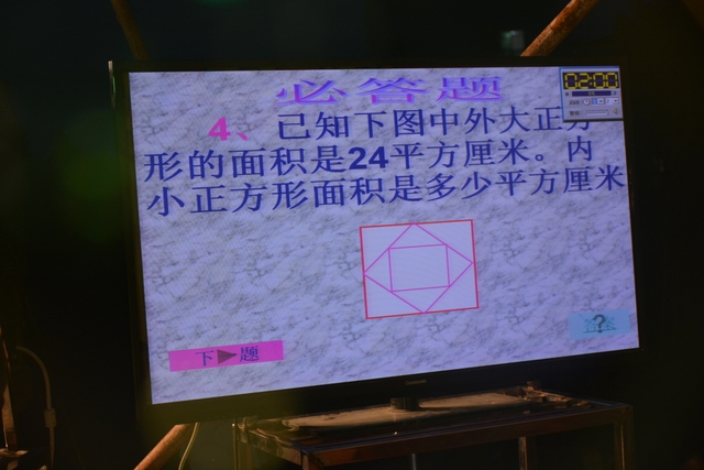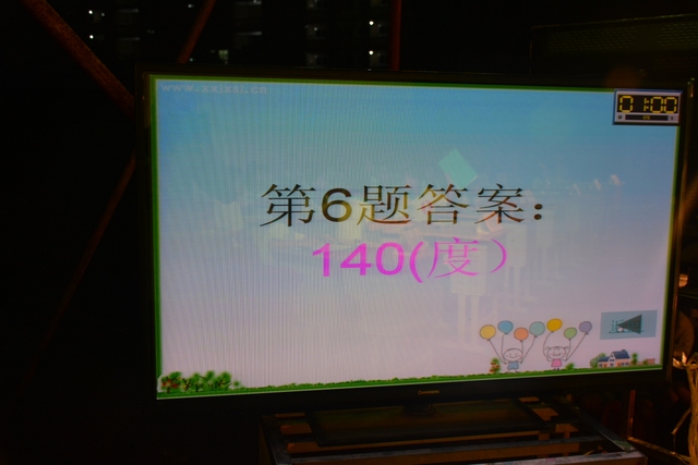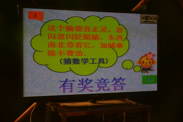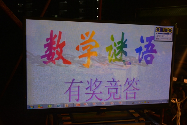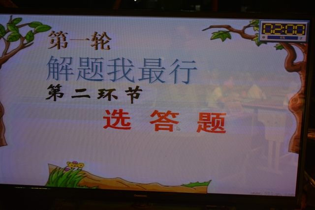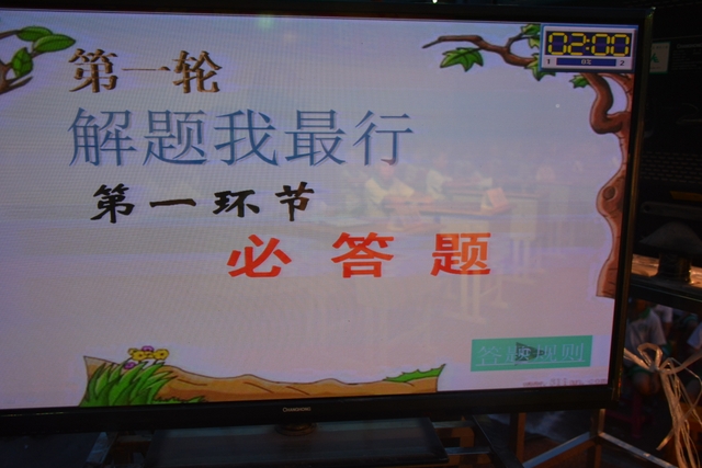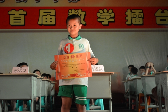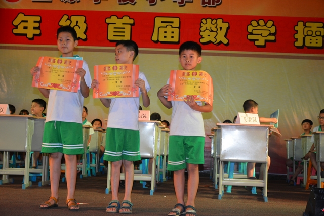 本台比赛由该年级蒋丽萍等7位老师率领的梦幻队、宇宙队、智慧队、志远队、飞虎队、无敌队、超能队等7支代表队组成。每个代表队由5名队员组成,每队一出场就自我介绍,呼叫口号,令人刮目相看。整台比赛由解题我最行(必答)、反应我最快(抢答)、合作最强大(合作完成)三个环节组成,中间插入了有奖竞猜(数学谜语)互动环节。解题我最行每位选手必答题开始没什么差距,因每位选手都是班上出类拔萃人物中选出来的,确是高手云集;到5组二选一时才慢慢开始拉开距离。反应我最快环节题目难度已比较大,竞争己比较激烈,差距也越拉越大,甚至出现有1题没1个选手做出的情况。而这一抢答环节与一般的抢答不同的是:抢到题的选手答对1题得10分,答错反扣5分;而没抢到题的选手只要解答正确也可得5分。在突出解题快的同时,最终拼的是解题实力的强弱。互动有奖竞猜环节,题目一亮出,抢答的呼叫声就此起彼伏,震聋入耳,将比赛推上了最高潮。合作最强大环节,不计入个人得分,只计入团体得分,5个队员可互相商量,加上带队数学老师可提示点拨,竞争倒不及前面反应我最快环节激烈。