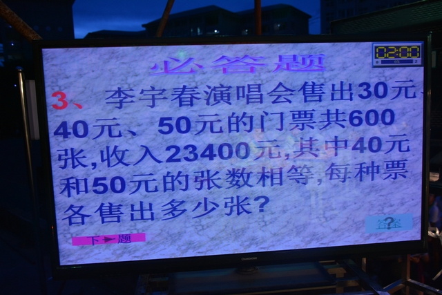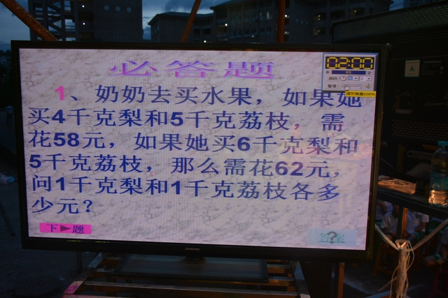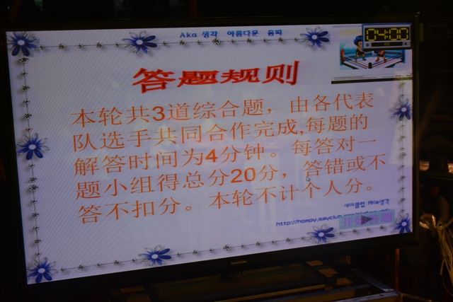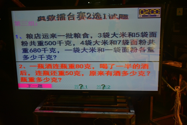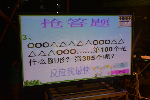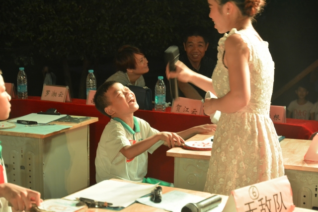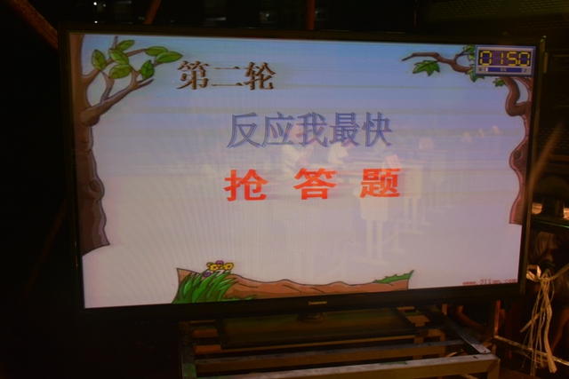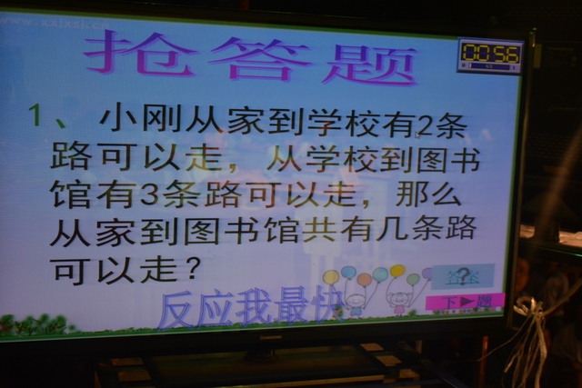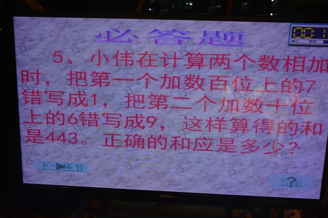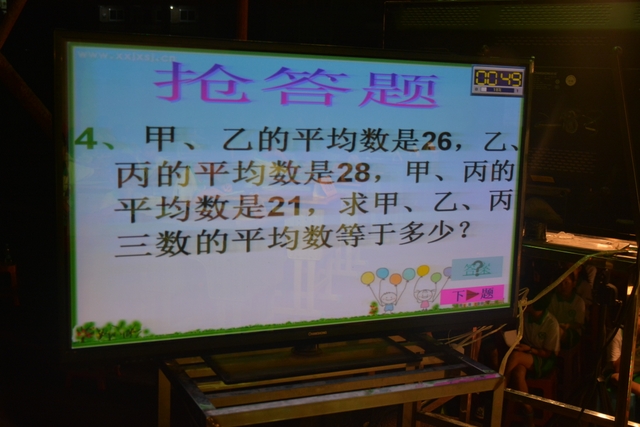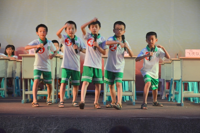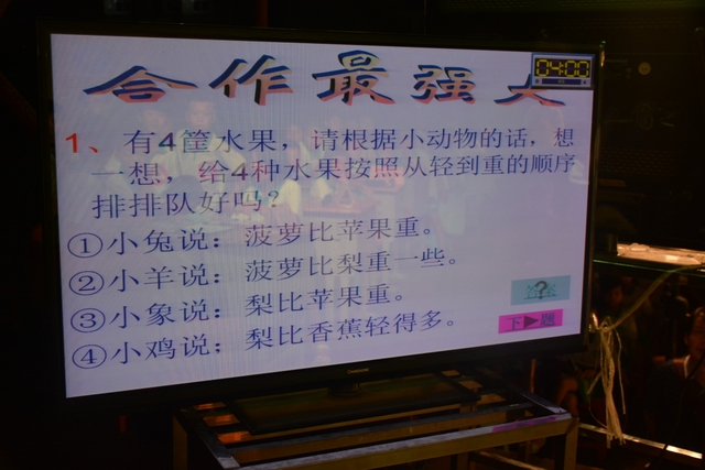 本台比赛由该年级蒋丽萍等7位老师率领的梦幻队、宇宙队、智慧队、志远队、飞虎队、无敌队、超能队等7支代表队组成。每个代表队由5名队员组成,每队一出场就自我介绍,呼叫口号,令人刮目相看。整台比赛由解题我最行(必答)、反应我最快(抢答)、合作最强大(合作完成)三个环节组成,中间插入了有奖竞猜(数学谜语)互动环节。解题我最行每位选手必答题开始没什么差距,因每位选手都是班上出类拔萃人物中选出来的,确是高手云集;到5组二选一时才慢慢开始拉开距离。反应我最快环节题目难度已比较大,竞争己比较激烈,差距也越拉越大,甚至出现有1题没1个选手做出的情况。而这一抢答环节与一般的抢答不同的是:抢到题的选手答对1题得10分,答错反扣5分;而没抢到题的选手只要解答正确也可得5分。在突出解题快的同时,最终拼的是解题实力的强弱。互动有奖竞猜环节,题目一亮出,抢答的呼叫声就此起彼伏,震聋入耳,将比赛推上了最高潮。合作最强大环节,不计入个人得分,只计入团体得分,5个队员可互相商量,加上带队数学老师可提示点拨,竞争倒不及前面反应我最快环节激烈。