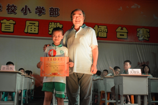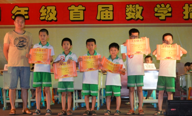 经过统分,团体飞虎队和智慧队最终力挫群雄,夺得1等奖,无敌队和志远队屈居2等奖,超能队、梦幻队、宇宙队垫底3等奖。个人何腾同学荣获冠军,杨超等3人荣获1等奖,谢杨瑜等6人获2等奖,欧小豪等7人荣获3等奖。校长罗湘云为团体1等奖及个人冠军选手颁奖并作了简短讲话,对辅导老师、参赛选手及全体在场同学给予充分肯定,结合今年高考情况介绍了学校“文科抓阅读,理科抓竞赛”的硕果。罗校长充满感情地说:数学是启发思维的种子,通过这样的竞赛慢熳掀起“爱数学、学数学、用数学”的热潮,并宣布了准备在小学实施分层教学的探索。周运根、刘溅生、刘龙军等领导为其它获奖团队及个人颁了奖。