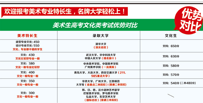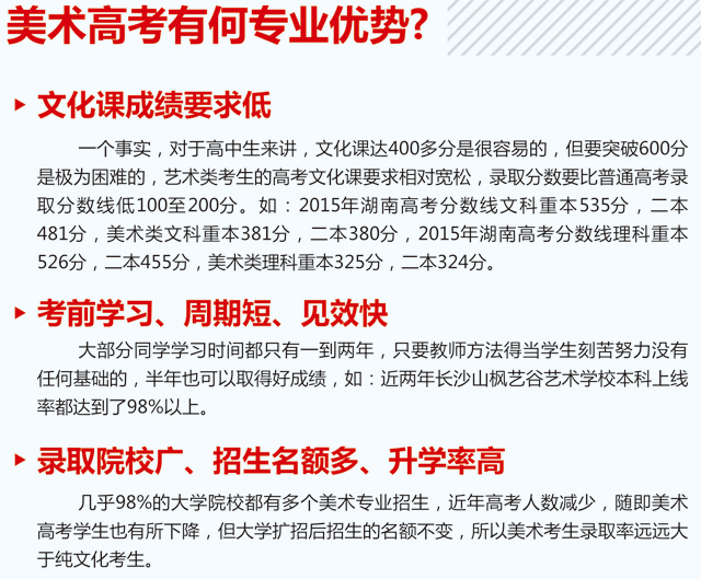 3、美术专业上线机会多。现在,学习美术专业的中小学生少之又少,远不及音乐和体育专业人数众多。很多美术类上线考生,到了高二文理分科甚至到了高三才开始美术专业的学习。因此,美术专业相对舞蹈、音乐等其他艺术专业来说易于速成。如果从高一开始学习美术专业,高考专业上线的概率很大。同时,因报考人数相对较少,导致对文化成绩的要求大约只有普通院校70%甚至更少。一般来说,如果专业上线了,考取清华美院或者中央美院,文化分数过450分就行了,上普通美术本科院校或专业的文化成绩甚至只需300多分。