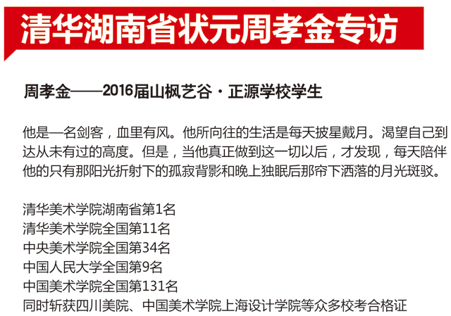 4、周孝金同学2016年高考,美术专业考出了清华大学湖南第1、全国第11的好成绩,文化成绩453分,总分超过录取线,清华美院要求考生语文单科90分,周孝金考了93分,英语要求75分,周孝金考了85分,各项指标均顺利过关!周孝金同学将成为耒阳市第二个考上清华大学美术学院的学生,给学弟学妹们做出了一个榜样!
