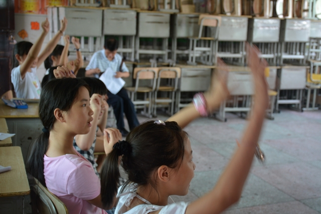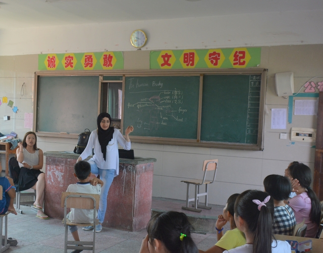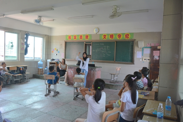 走进教室,看到黑板上贴着一个人的正面像,人像两边分别用英语和汉语写着:hair,forehead,eye,ear,mouse,jaw,neck,hand,leg,foot,头发、额头、眼睛、耳朵、嘴巴、下巴、脖子、手、脚、腿。国际志愿者带领同学们反复朗读英语单词,读几遍之后引导孩子们自己大声朗读,边读边用手摸自己身上的各个部位,同学们读得声音宏亮,读得津津有味。经了解,发现老师先给孩子们每人发一张白纸,吩咐学生用铅笔画画,画什么由学生随意,画完后用英语起个名字,用腊笔涂上颜色。老师将学生的画收上来后,发现孩子们画人物的最多,便临时决定英语课就学认识人的主要部位。这种课程设计机智灵活,彻底颠覆了中国传统的教学形式,融美术教学和英语教学于一炉,生动形象,让学生学得兴趣盎然,易于接受,不失为一种教学创新,确实让人大开眼界。