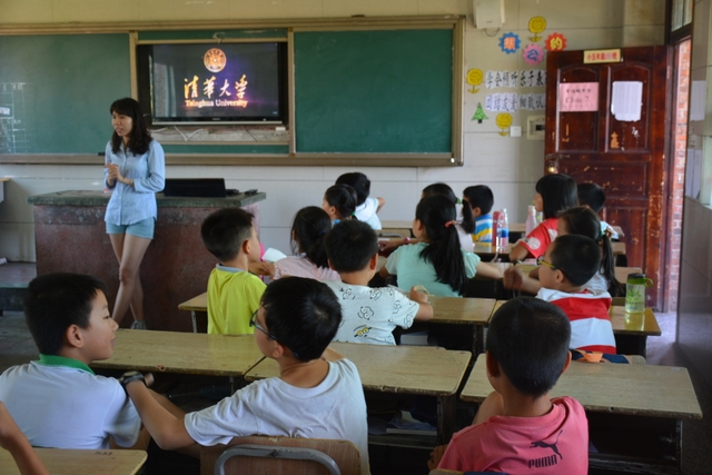 志愿者老师为激发学生兴趣,用电脑将清华大学的主要景点诸如古朴的校门、水木清华、图书馆等放映在黑板中间的显示屏上,学生们听得兴味盎然,看得津津有味。