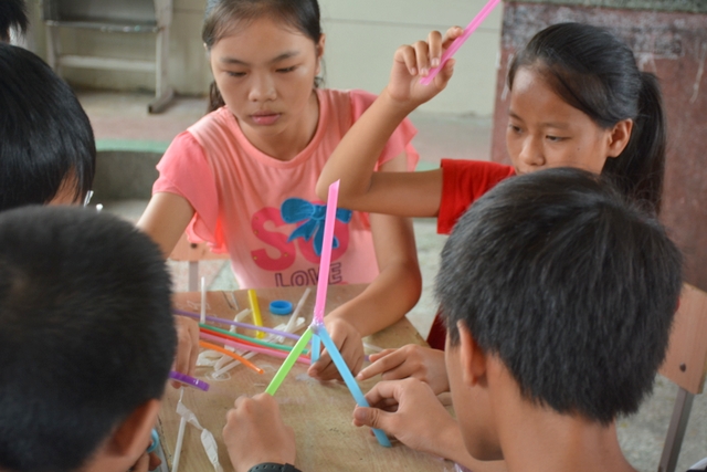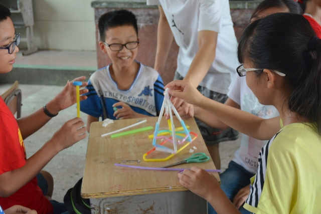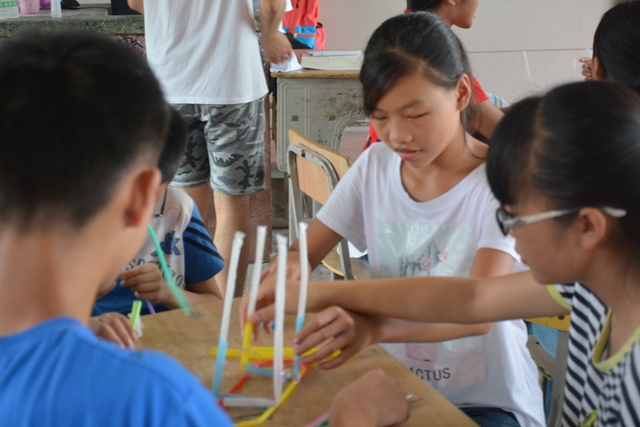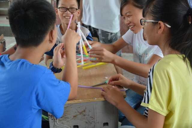 老师首先给孩子们讲述了三个词的含义,分别是想象、合作与创造。然后,鼓励孩子们大胆想象,发扬合作精神,发挥创造力。将班上孩子分成3个组做游戏:每个小组得到同样数量的大小不一的吸管,一把剪刀,一卷胶带和一颗棉花糖。要求孩子们在15分钟之内用这些东西搭建一个建筑,建筑最高处放上一颗棉花糖,哪个组的建筑最高哪个组赢。