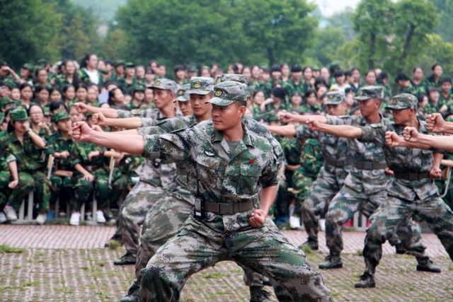 在同学们的殷切期待和盼望中,来自75104部队的教官们首先闪亮登场,为大家带来了一场精彩纷呈的会操表演,赢得同学们雷鸣般阵阵掌声。立正、稍息、向右看齐、向前看。向右转、向左转、向后转,齐步走、跑步走、敬礼。每一个动作都是如此整齐、有序,无一不在彰显一个战士应有的风范和风采。