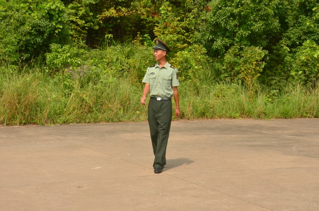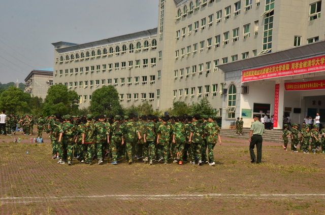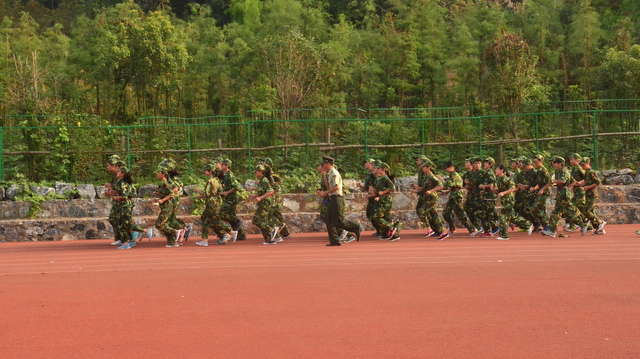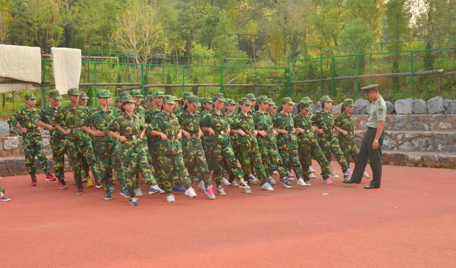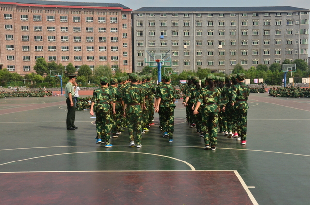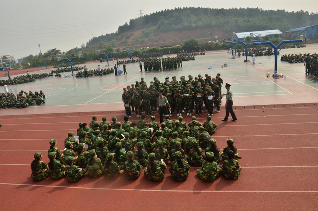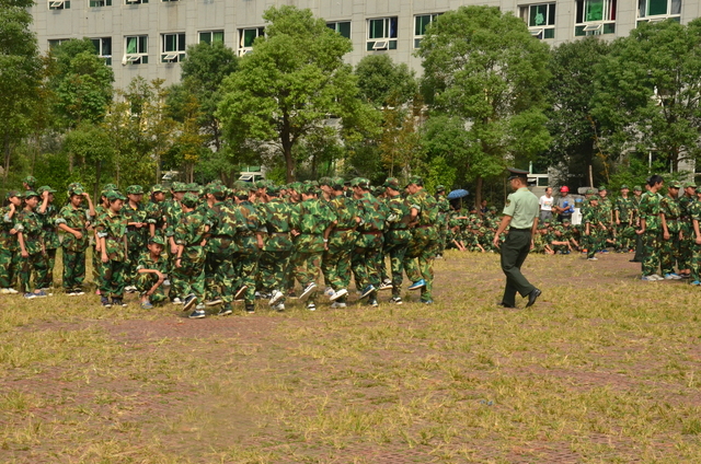 下午四点多钟,初中部举行中期抽样会操,三个班的同学汇报了他们三天来的军训成果。立正,稍息,跨立,敬礼,向右看齐向左看齐,向左转向右转向后转侧身45度转……同学们聚精会神,表演得非常认真,台下报以一阵阵热烈掌声。286班同学的表演受到部队首长的充分肯定和表扬。