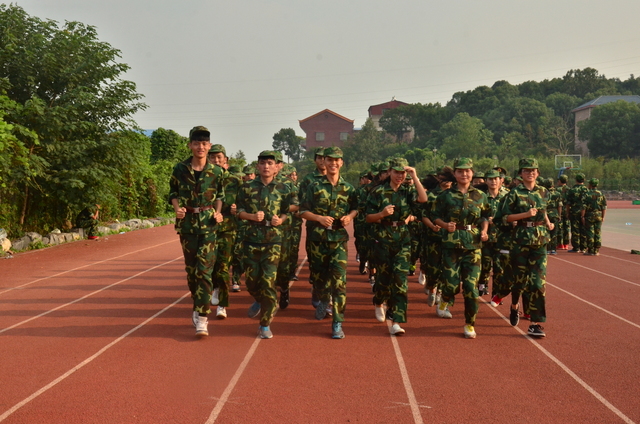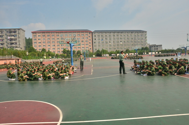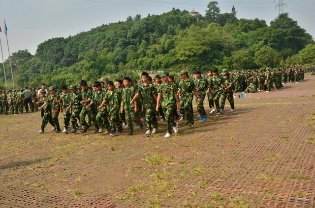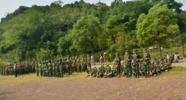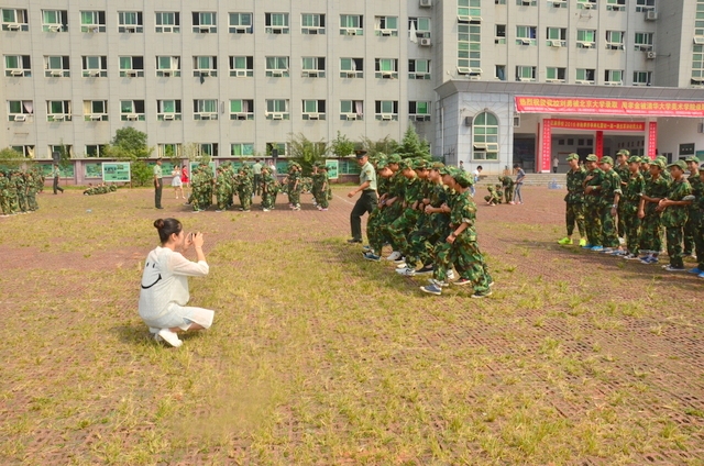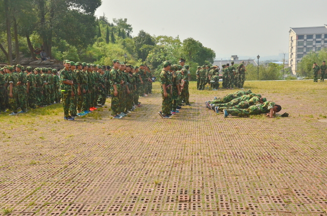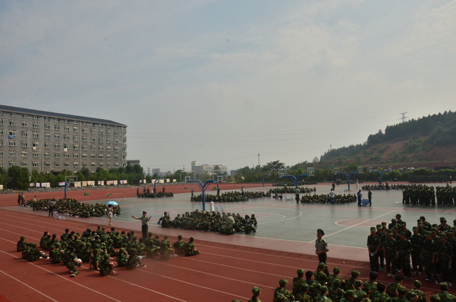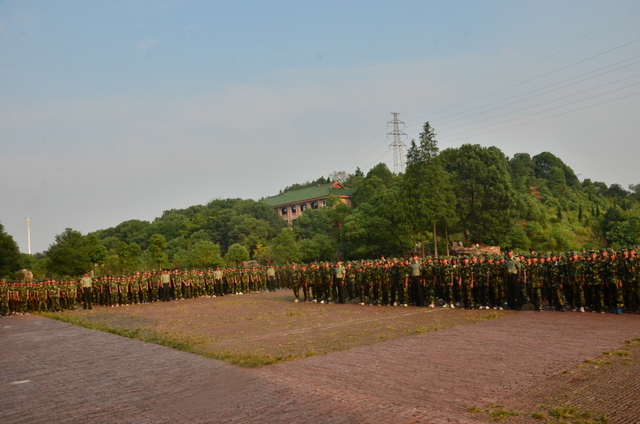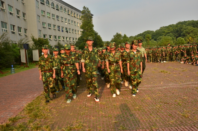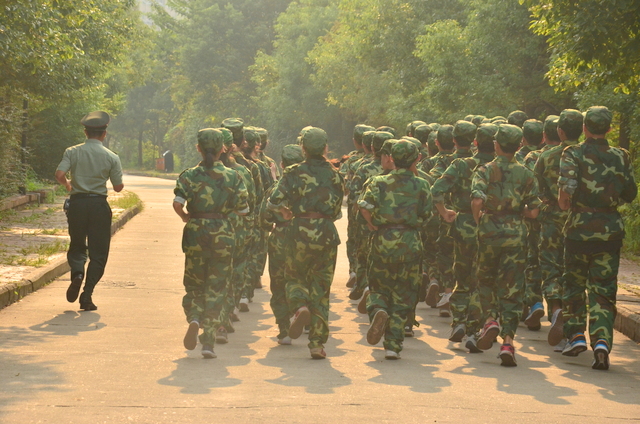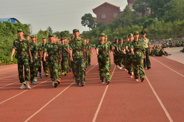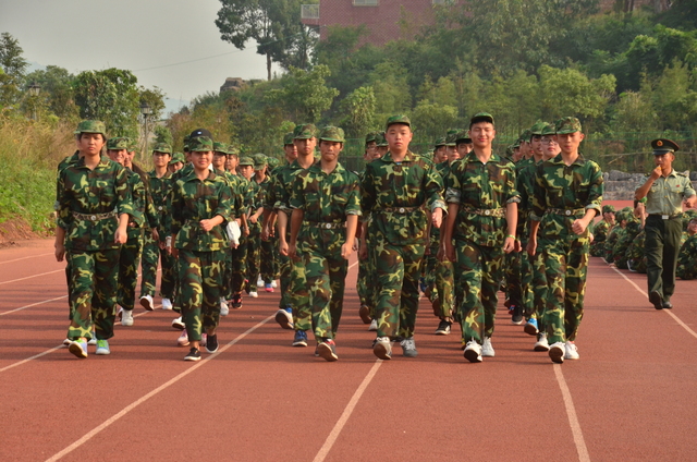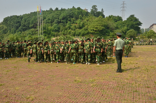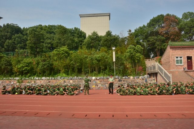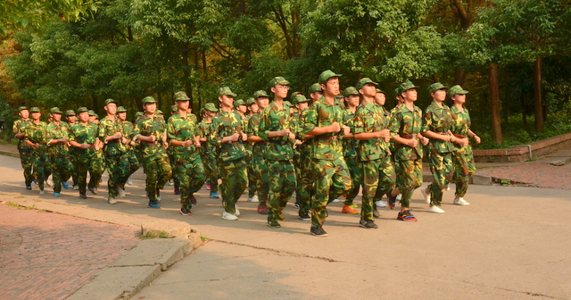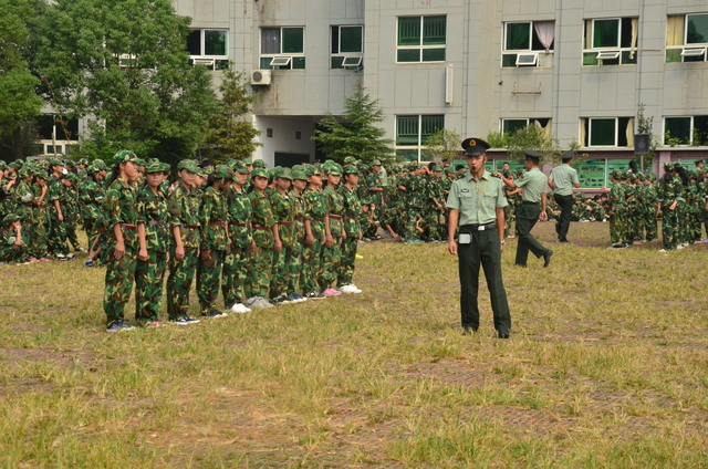 今天的军训场地更热闹。齐步走刷刷刷刷的脚步声,跑步走“一二三四”的口号声和董董董董的节奏声,拉歌“一二三,快快快”、“一二三四五,我们等的好辛苦”、“一二三四五六七,让人等的好着急”的呼叫声,“日落西山红霞飞,战士打靶把营归”、“学习雷锋好榜样,终于人民忠于党”的歌声,此起彼伏,响彻云霄。