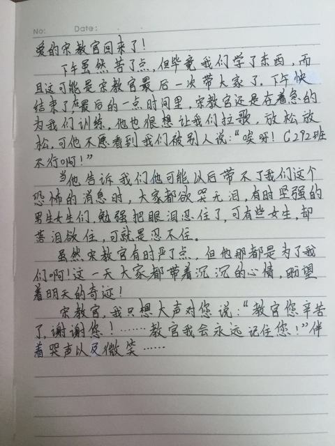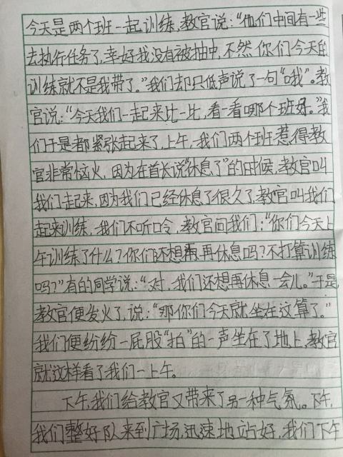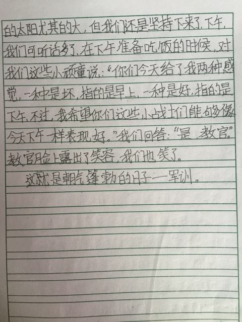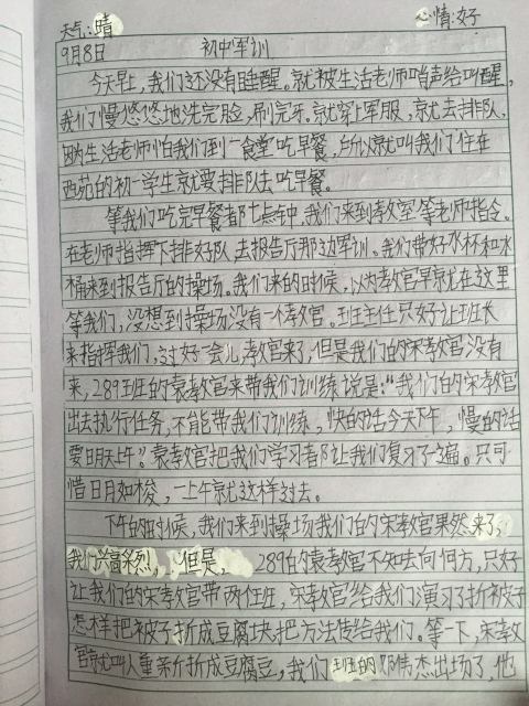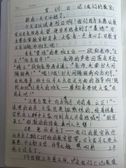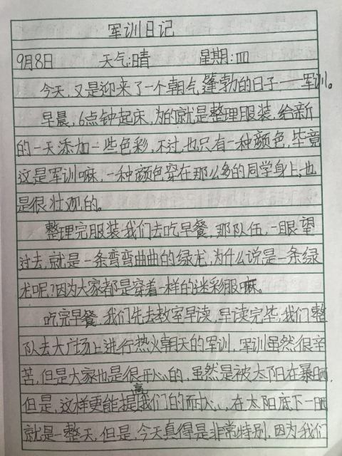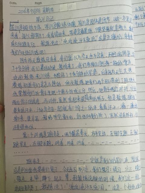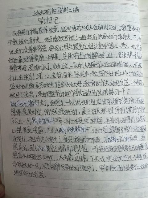 军训,是辛苦的,同时又是快乐的,令人兴奋,令人激动,令人期待,令人不舍。同学们在训练之余,用日记写下了他们的酸甜苦辣。