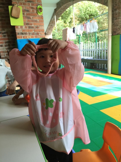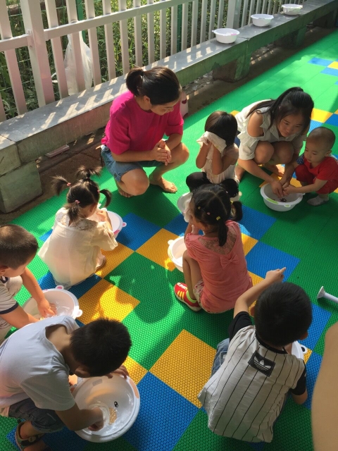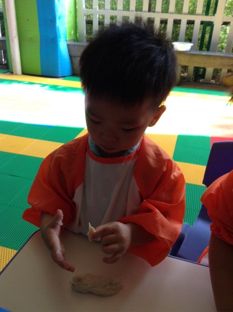 揉面团、上颜色、捏成型:先让小朋友体验面粉的手感,然后加水揉面团…