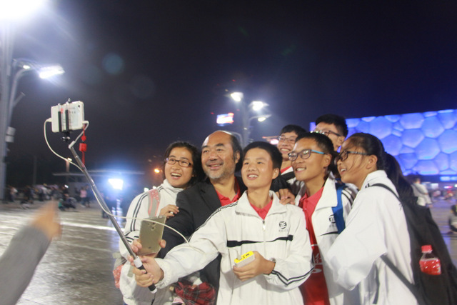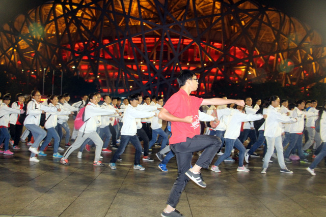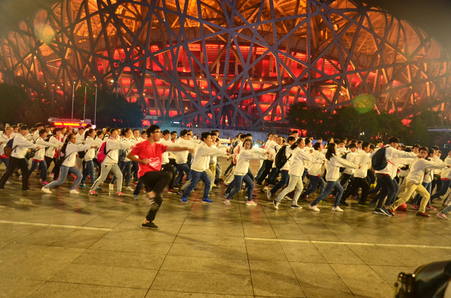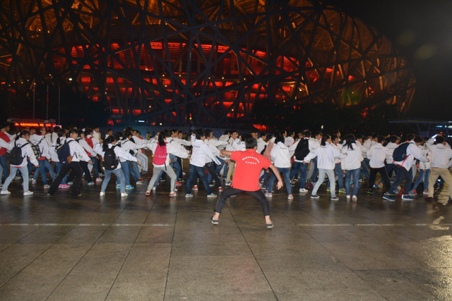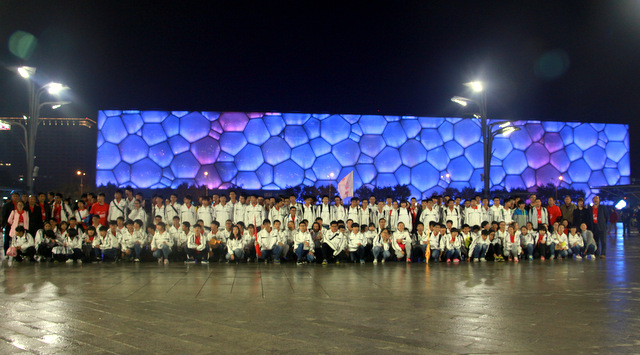 晚上6时许,夜幕降临,华灯初上,雨后的北京虽略有凉意,但参加正源学校2016北京励志行的学生们却个个热情似火。在鸟巢和水立方中间的广场上,学生们拿起手机,相互拍照留念,并在广场上集体打拳,吸引了不少游客的目光和镜头。