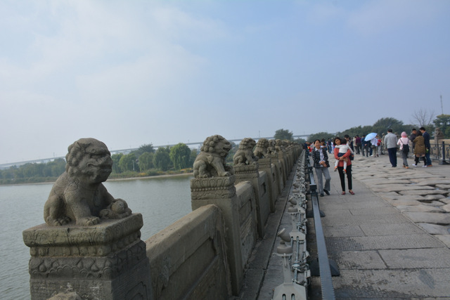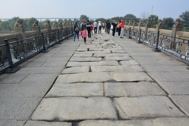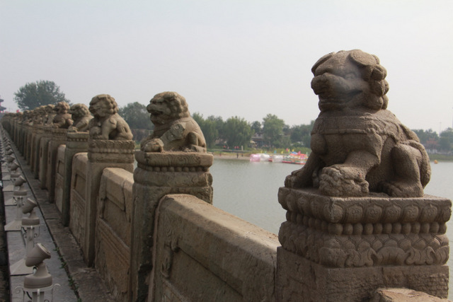 卢沟桥始建于1189年6月,1192年3月完工。两侧石雕护栏各有140条望柱,柱头上均雕有石狮,形态各异,据记载原有627个,现存501个。石狮多为明清之物,也有少量的金元遗存。