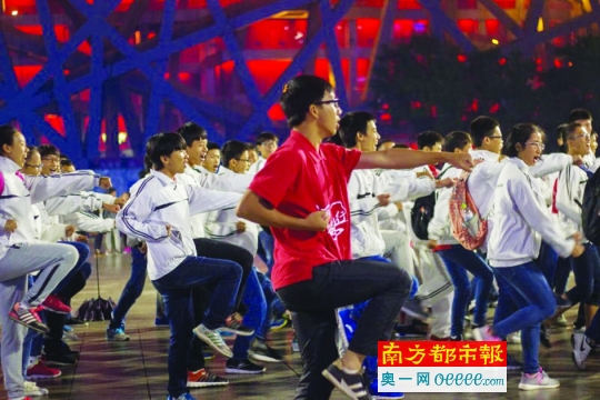 学生在“鸟巢”前打拳。