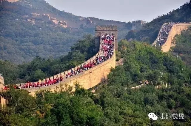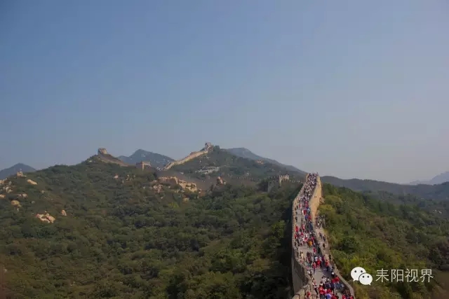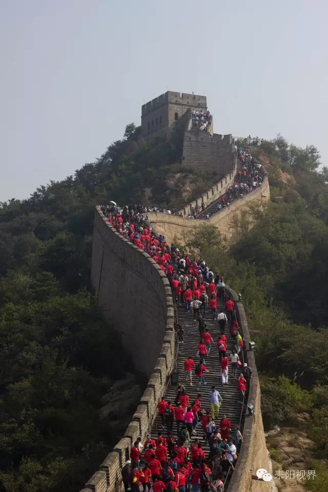 两百学生拉成长长的队伍,像一条小龙攀上长城这条巨龙的脊背。