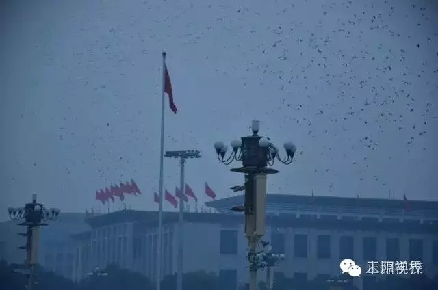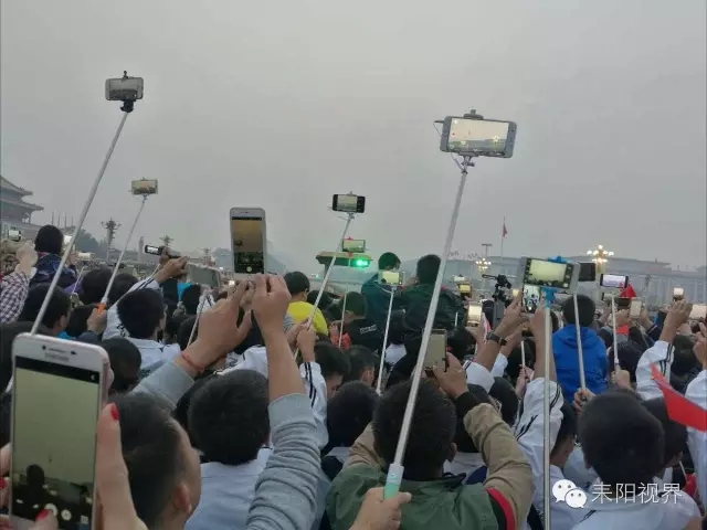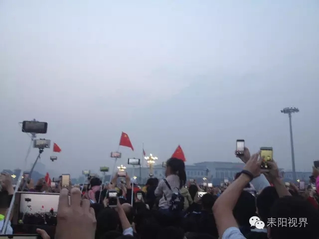 静静的等待,6点10,只听到一阵鼓点声,没有听到国歌声,也没有看到护旗队的雄姿,只听到“升起来了!升起来了!!”,便看到五星红旗像大海中一面风帆,沿着桅杆冉冉升起。人们举着自拍杆拍照,拍杆上插着一面面小国旗,我只感到四周的小国旗,托起一面大国旗,升向天宇。