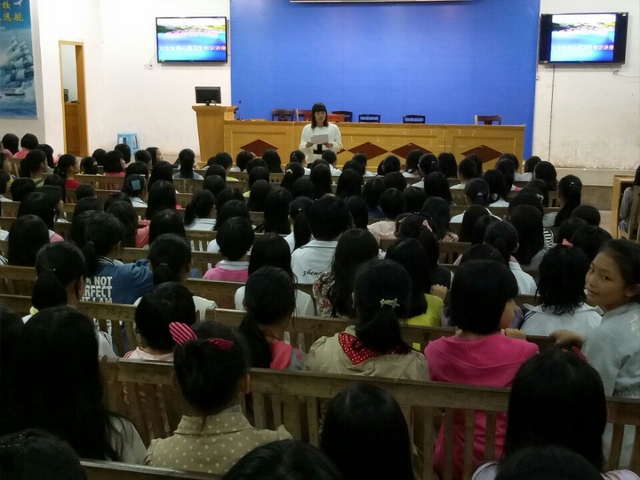 10月15日晚上,在学校报告厅小学部六年级举行了生理卫生知识讲座。讲座由小学部彭升银老师主讲,六年级200余名女生聆听了讲座。