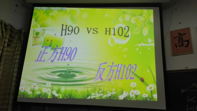 在H90与H102的赛场上,正方辩手思维灵敏,巧舌如簧,对时间的掌控较好,反方可能过于紧张,又背对计时屏幕,在陈词和时间把握方面稍有欠缺但其四辩总结陈词很有说服力,准备很充分,虽然反方稍逊一筹。但俗话说的好,有比赛就有胜负,真正重要的不是输赢而是从中所学到的种种知识和一种积极向上的精神。